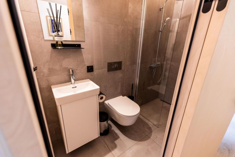 Das moderne Badezimmer ist mit Dusche, Waschbecken und WC ausgestattet. Kostenloses WLAN sowie Parkmöglichkeiten direkt an der Cabin sind vorhanden.