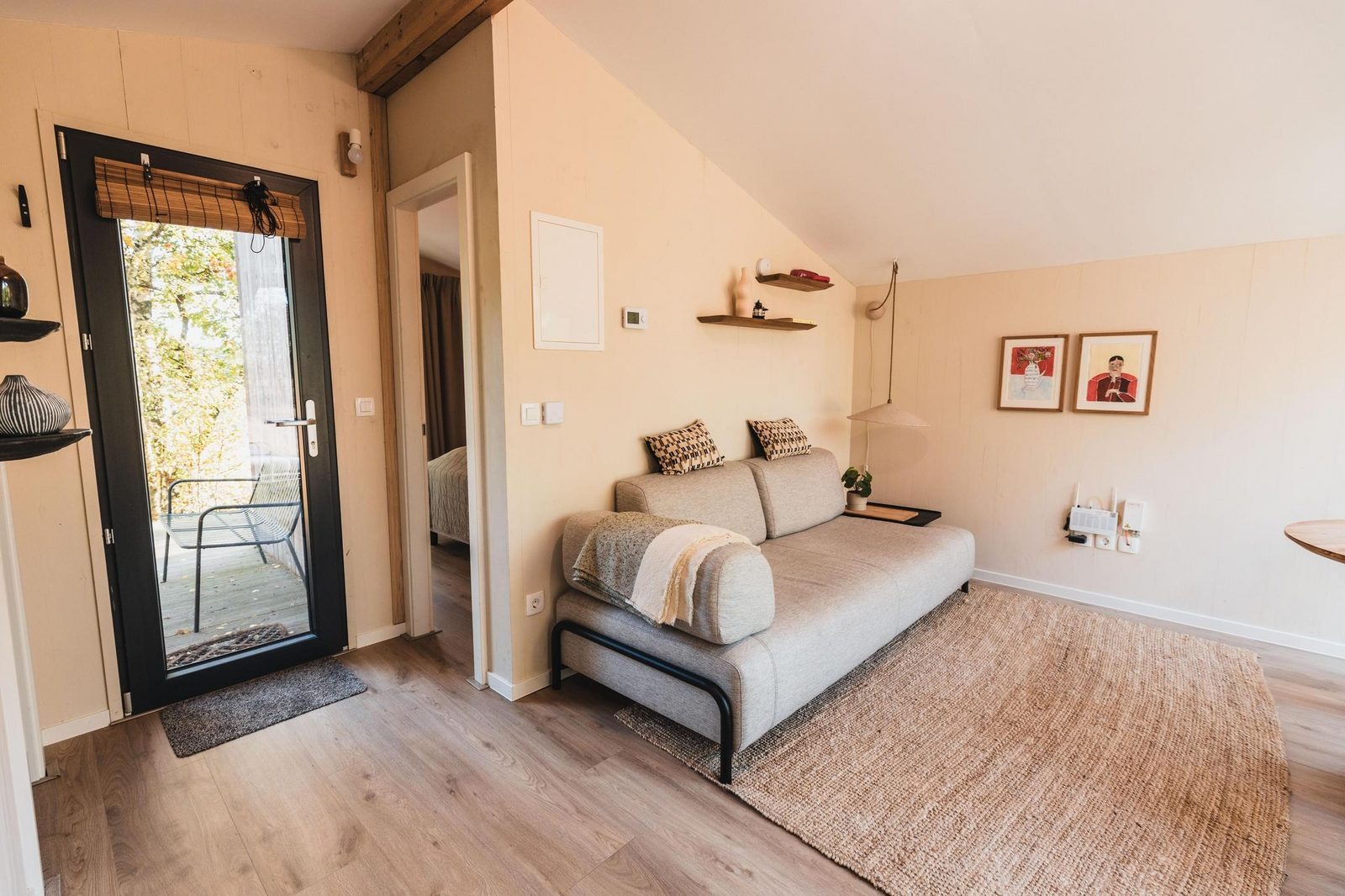 Rund um die Cabin befinden sich mehrere Terrassen an der Vorder- und Rückseite, sodass Sie zu verschiedenen Tageszeiten draußen sitzen können. Die Holzveranda ist mit einem komfortablen Loungeset eingerichtet und bietet Blick auf das Wasser und das umliegende Grün. Dank der geschützten Lage genießen Sie hier ungestört die frische Luft. Wanderwege befinden sich in direkter Nähe, sodass Sie von der Cabin aus direkt in die Natur starten können.