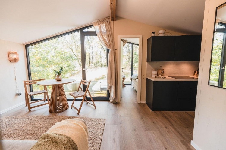 Im Inneren ist die Cabin komfortabel und praktisch eingerichtet. Der Wohnbereich verfügt über einen Essplatz mit freiem Blick nach draußen und schließt an die offene Küche an. Diese ist ausgestattet mit Nespresso-Maschine, Kühlschrank, Geschirr, Besteck und Küchenutensilien. Die Fußbodenheizung, die in jedem Raum separat regulierbar ist, sorgt das ganze Jahr über für ein angenehmes Raumklima.