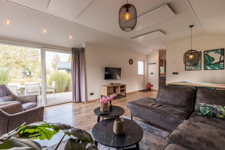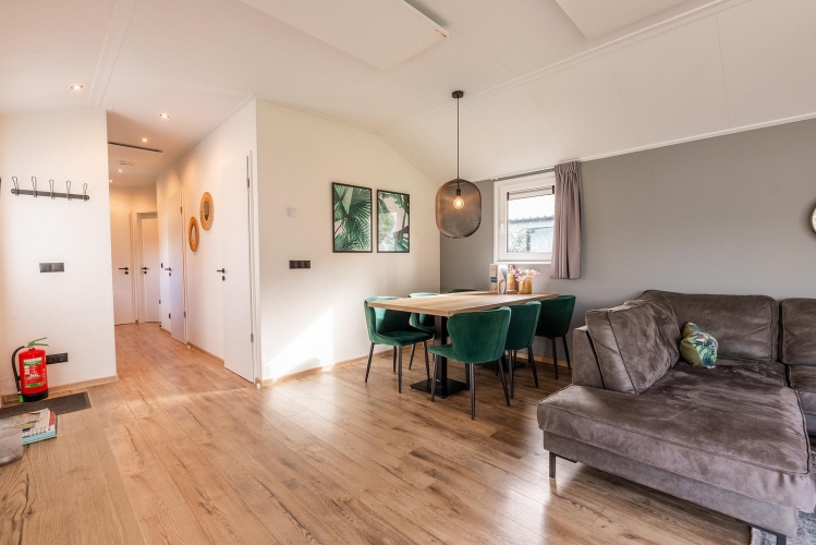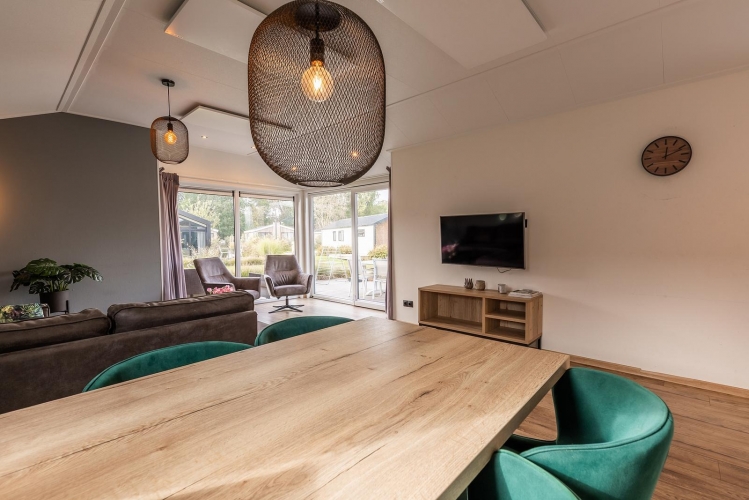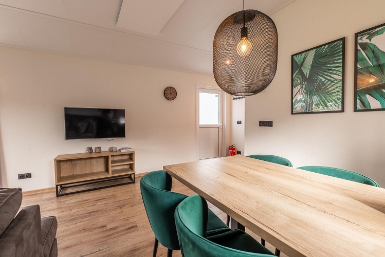 Schon beim Betreten fällt die helle und offene Atmosphäre dieses freistehenden Chalets auf. Große Fensterfronten sorgen für viel Tageslicht und verleihen dem Wohnbereich ein großzügiges Raumgefühl. Das Wohnzimmer ist mit einer komfortablen Sitzecke und einem Fernseher eingerichtet – ein angenehmer Ort, um nach einem Tag im Freien gemeinsam zu entspannen. Am Esstisch gibt es ausreichend Platz für gemeinsame Mahlzeiten oder einen Spieleabend.