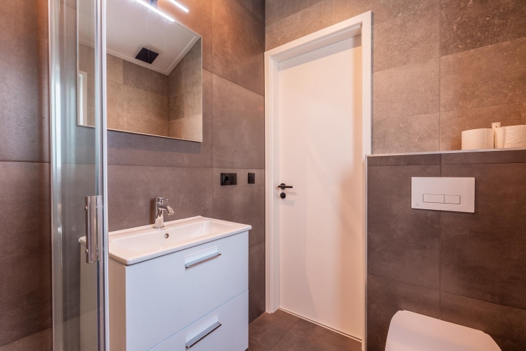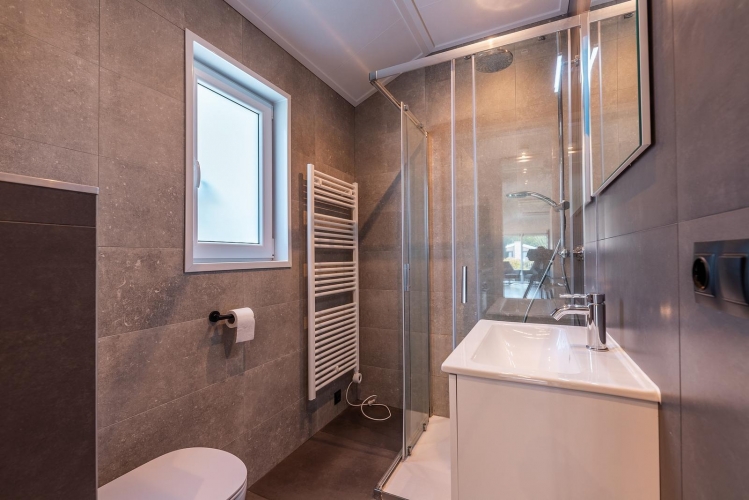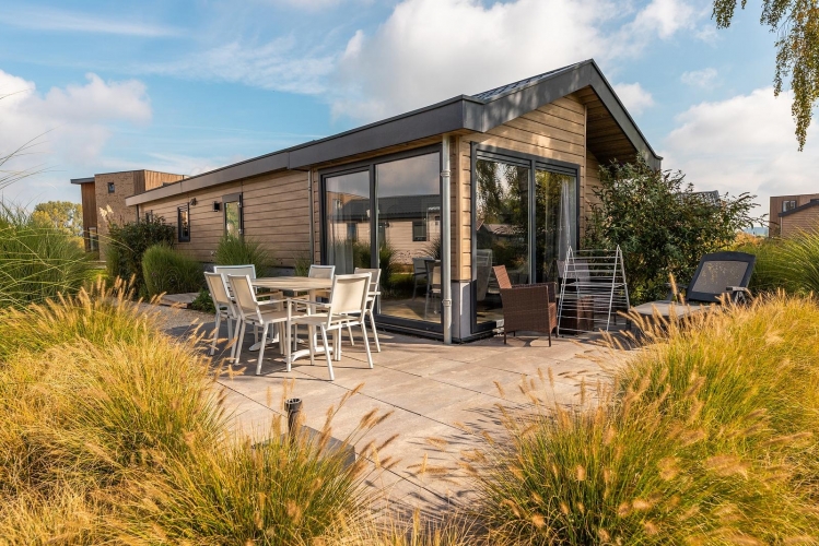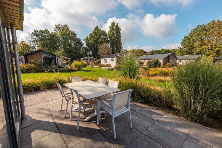 Durch die Terrassentüren gelangen Sie in den großzügigen Garten mit Terrasse, Gartenmöbeln und Sonnenschirm. Hier genießen Sie viel Privatsphäre und reichlich Platz im Freien – ideal zum Entspannen, für ein Frühstück in der Sonne oder um den Tag ruhig ausklingen zu lassen. Die grüne Umgebung trägt zu einer entspannten Atmosphäre rund um das Chalet bei.