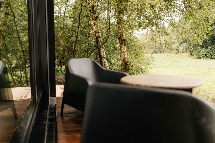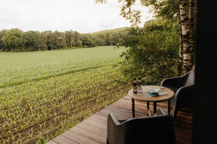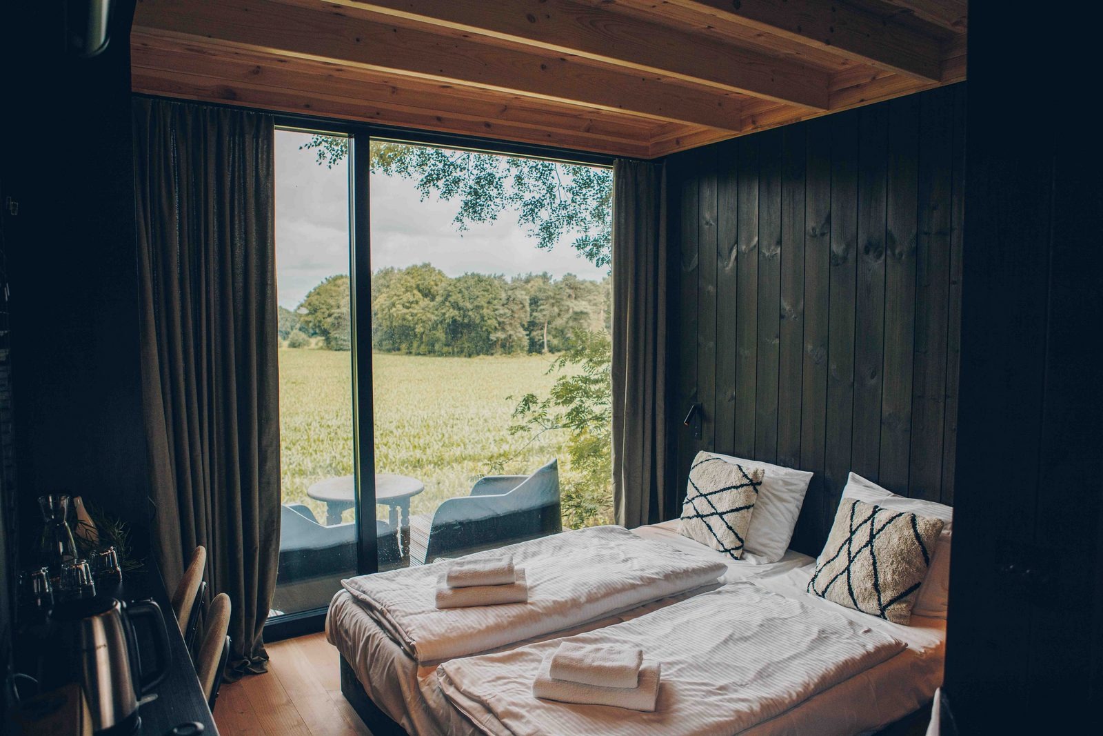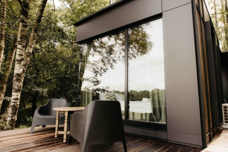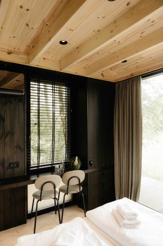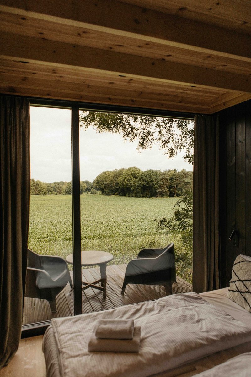 Diese exklusive Forest Cabin ist ein stilvoller und kompakter Rückzugsort für zwei Personen, konzipiert als besondere Design-Cabin mitten in der Natur. Das Interieur ist im skandinavischen Stil gestaltet und verbindet Ruhe, Schlichtheit und Komfort. Große Fensterfronten sorgen für viel Tageslicht und einen freien Blick auf die sanft hügelige Landschaft und die umliegenden Felder.
