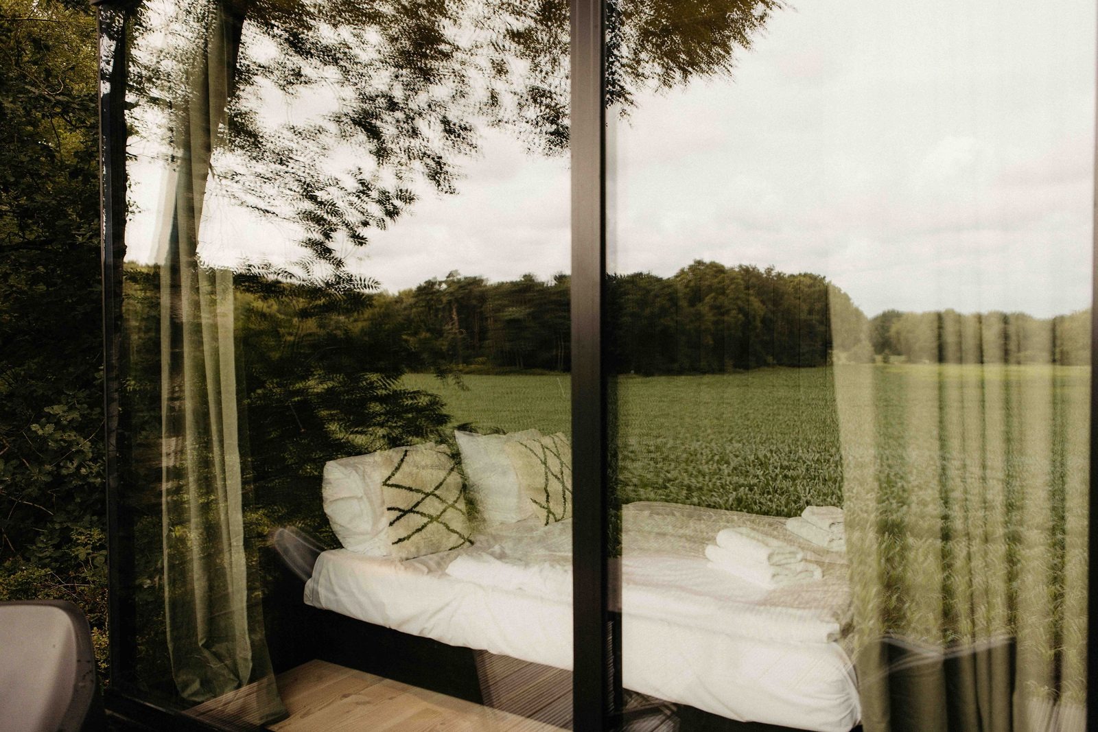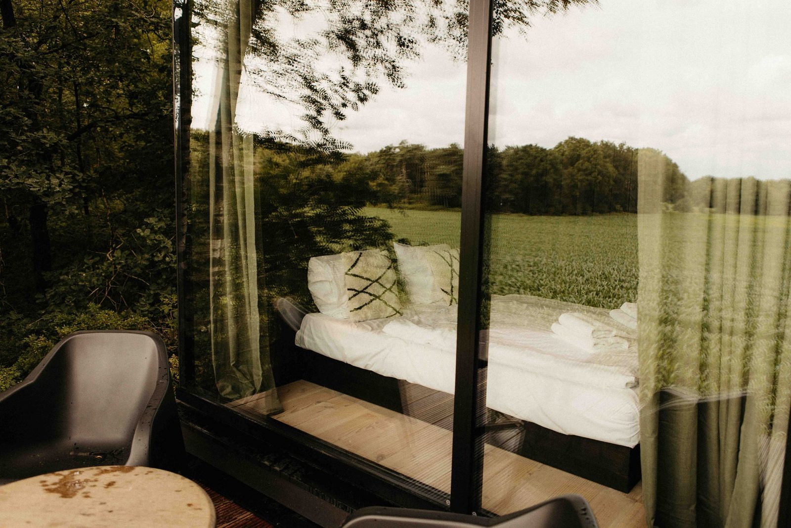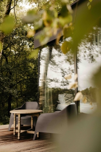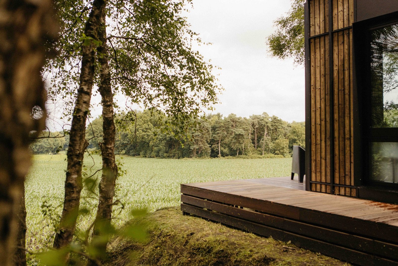 Diese exklusive Forest Cabin ist ein stilvoller und kompakter Rückzugsort für zwei Personen, konzipiert als besondere Design-Cabin mitten in der Natur. Das Interieur ist im skandinavischen Stil gestaltet und verbindet Ruhe, Schlichtheit und Komfort. Große Fensterfronten sorgen für viel Tageslicht und einen freien Blick auf die sanft hügelige Landschaft und die umliegenden Felder.
