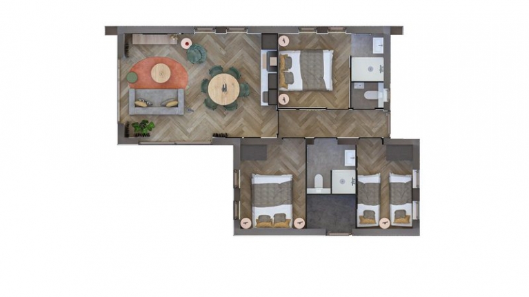 De woning beschikt over drie smaakvol ingerichte slaapkamers, waarvan één met een ensuite badkamer voor extra privacy. De extra badkamer en het apart toilet zorgen ervoor dat er altijd voldoende voorzieningen zijn voor de gehele groep, zodat iedereen zich comfortabel voelt.