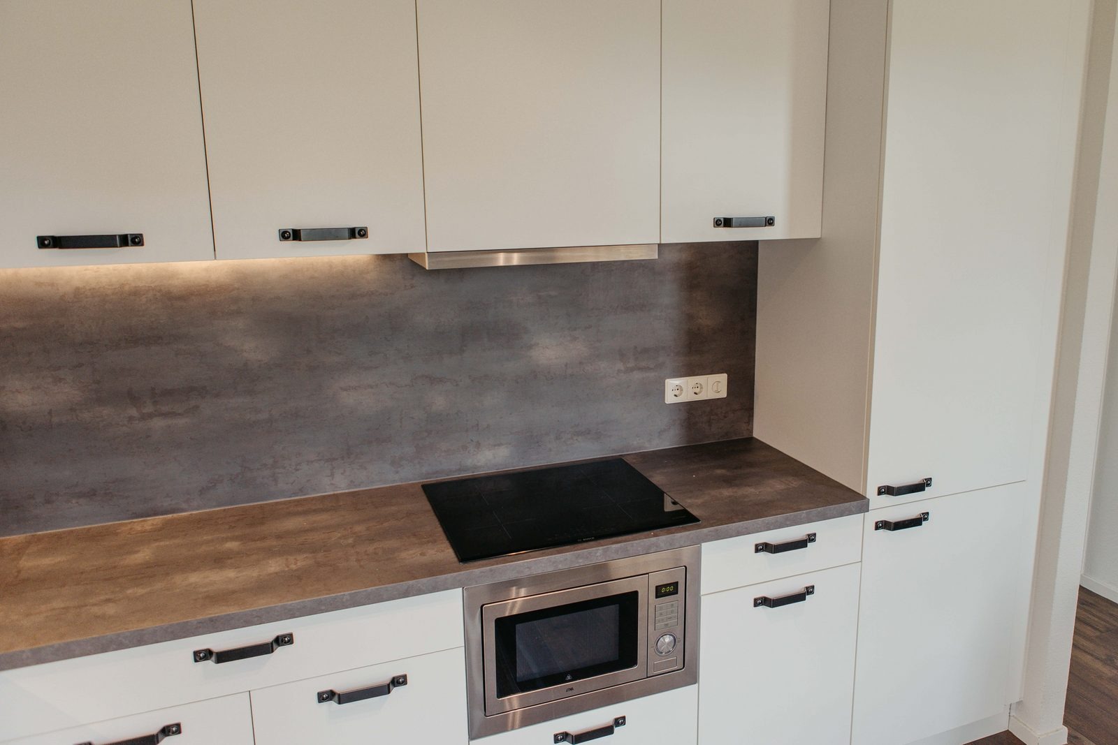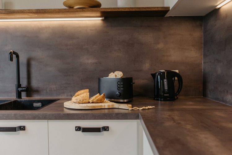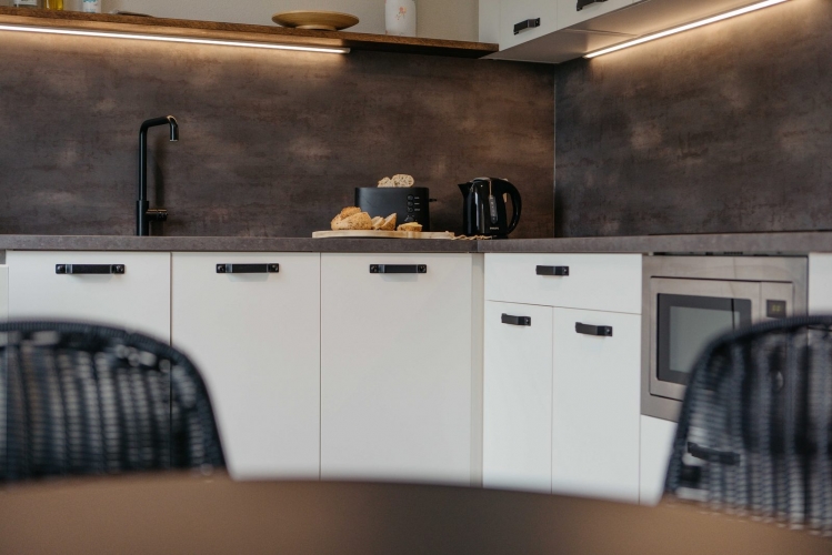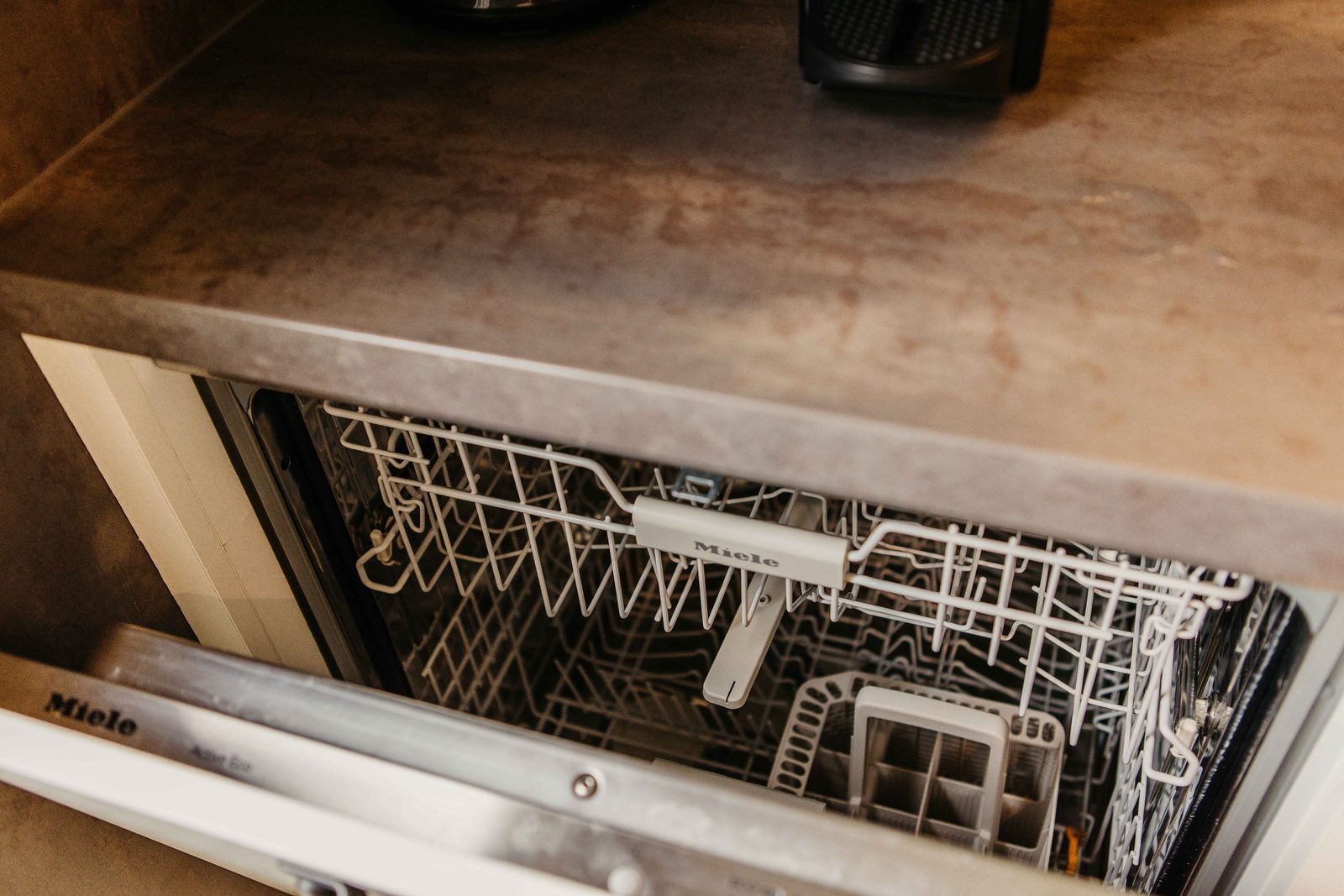 In der modernen Küche findest du alles für ausgiebiges Kochen: ein 5-Zonen-Induktionskochfeld, Kombi-Mikrowelle, Geschirrspüler, Gefrierschrank sowie sowohl eine Nespresso- als auch eine Filterkaffeemaschine.