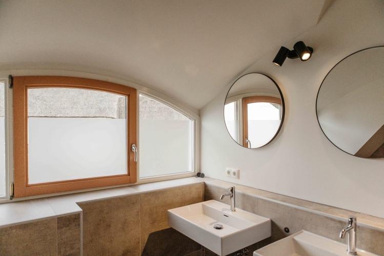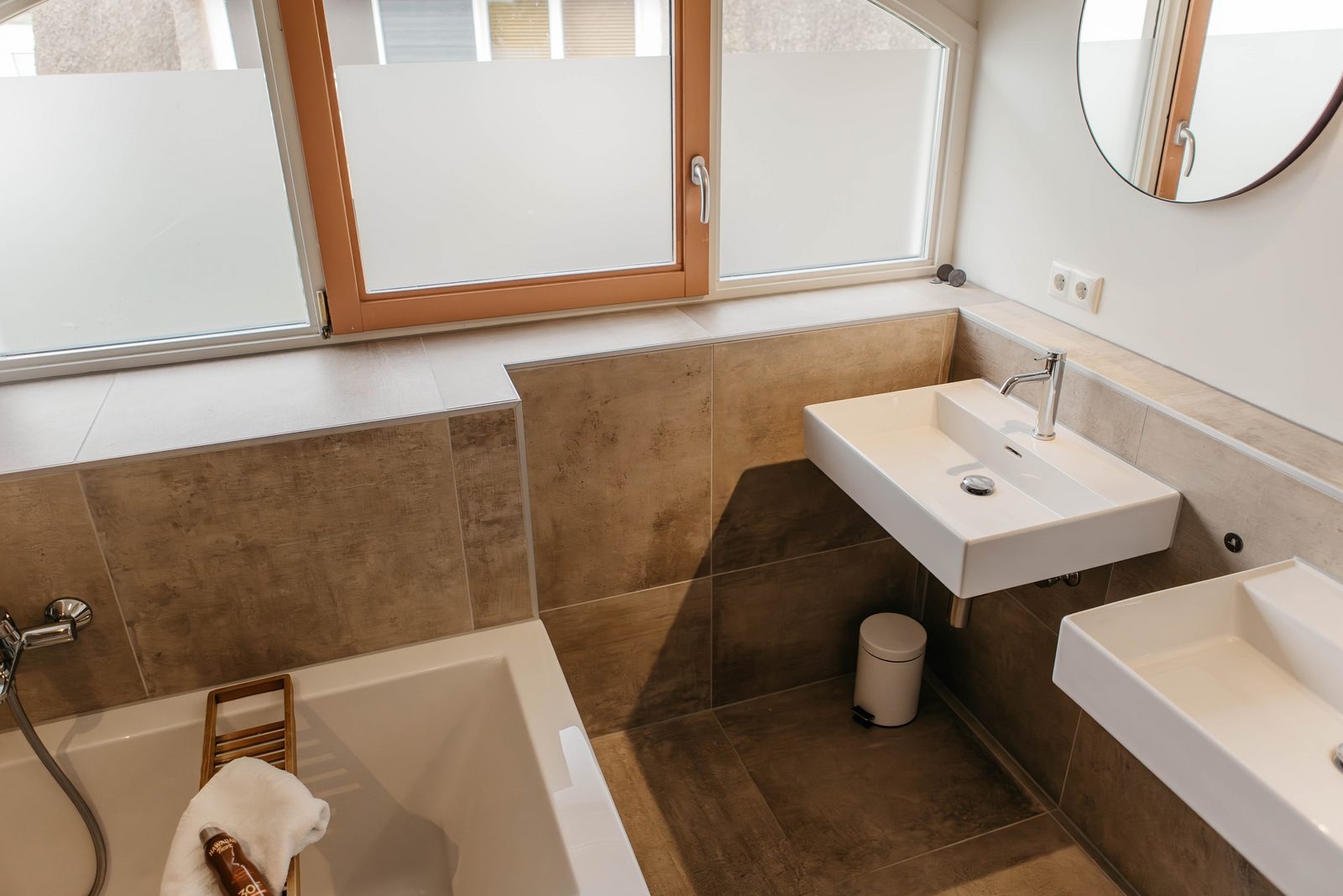 Das luxuriöse Badezimmer verfügt über eine Badewanne, Dusche und Waschbecken; zusätzlich gibt es ein separates WC im Erdgeschoss. Darüber hinaus sind eine Waschmaschine, Fliegengitter und viel Stauraum vorhanden.