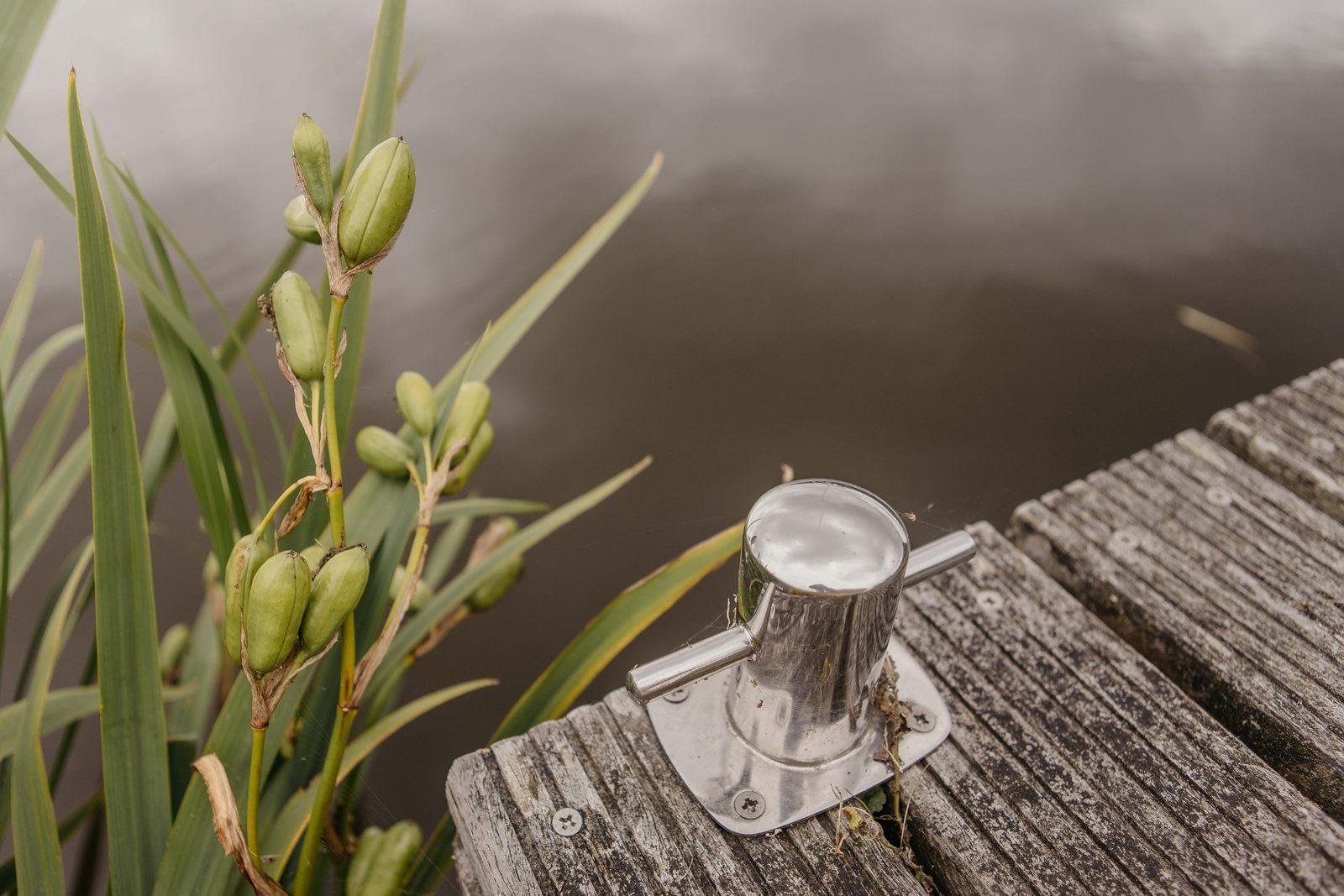 Der private Steg macht es einfach, anzulegen oder entspannt am Wasser zu sitzen. Die unmittelbare Umgebung wirkt offen und weitläufig, mit ständigem Blick auf den glitzernden See.