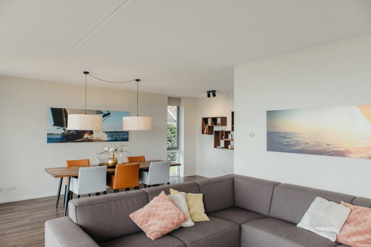 Diese helle und großzügige Unterkunft ist vollständig auf komfortables Wohnen am Wasser ausgerichtet. Das Wohnzimmer verfügt über große Fensterfronten, die den See wie ein lebendiges Gemälde ins Innere holen, während der Wintergarten und die gemütliche Sitzecke eine warme, einladende Atmosphäre schaffen.