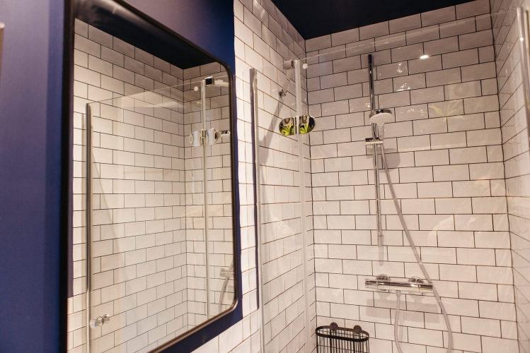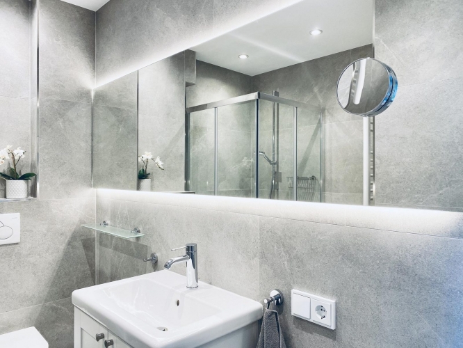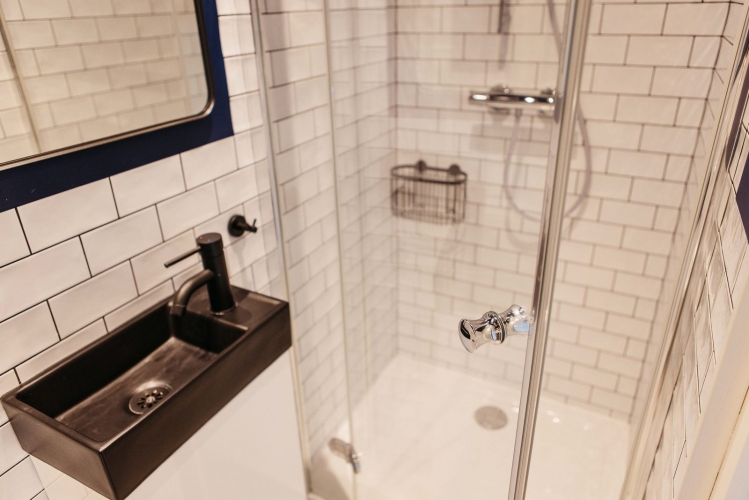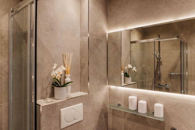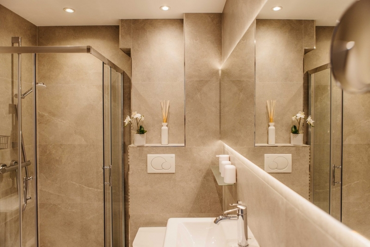 Im Erdgeschoss steht ein zweites Badezimmer mit Dusche und WC zur Verfügung – ideal für Familien oder Gruppen.