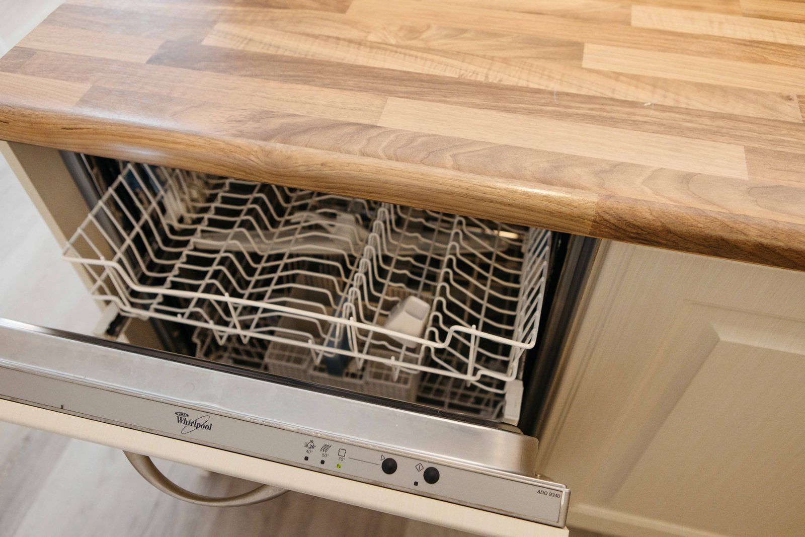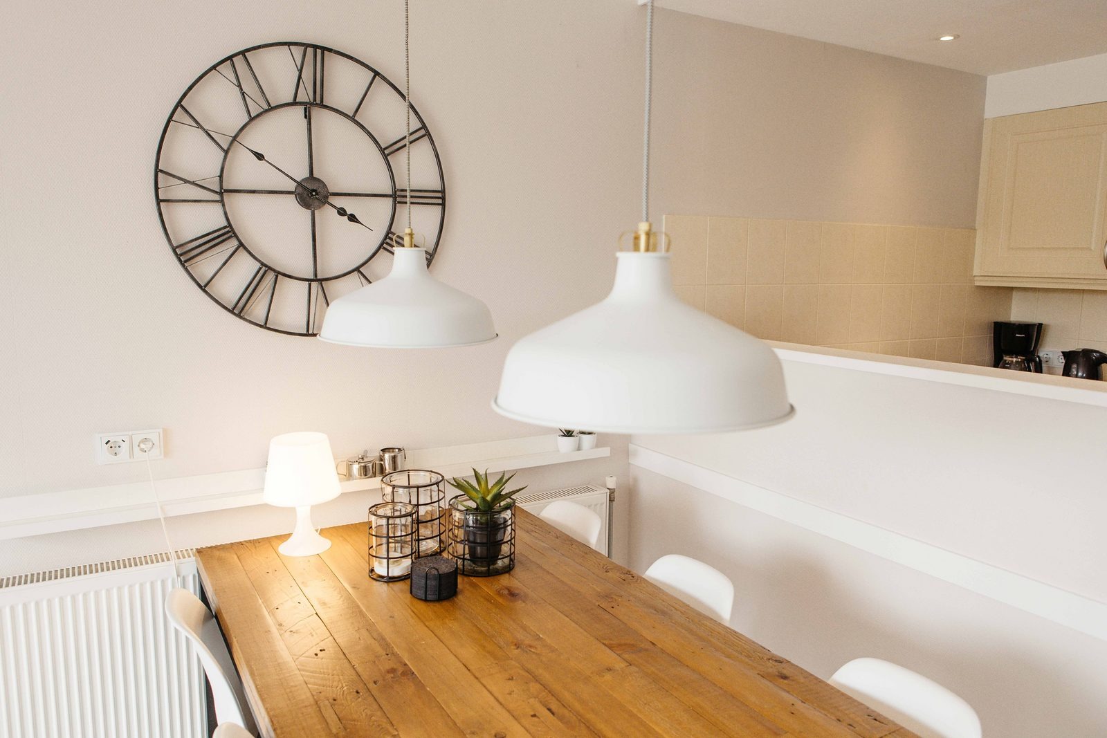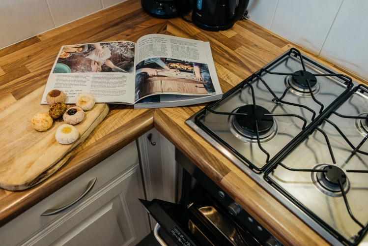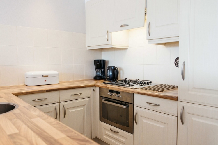 Die moderne, offene Küche ist ausgestattet mit u. a. einem 4-Flammen-Gasherd, Kombimikrowelle, Kühlschrank mit Gefrierfach, Filterkaffeemaschine, Wasserkocher, Geschirrspüler und vollständigem Kücheninventar.