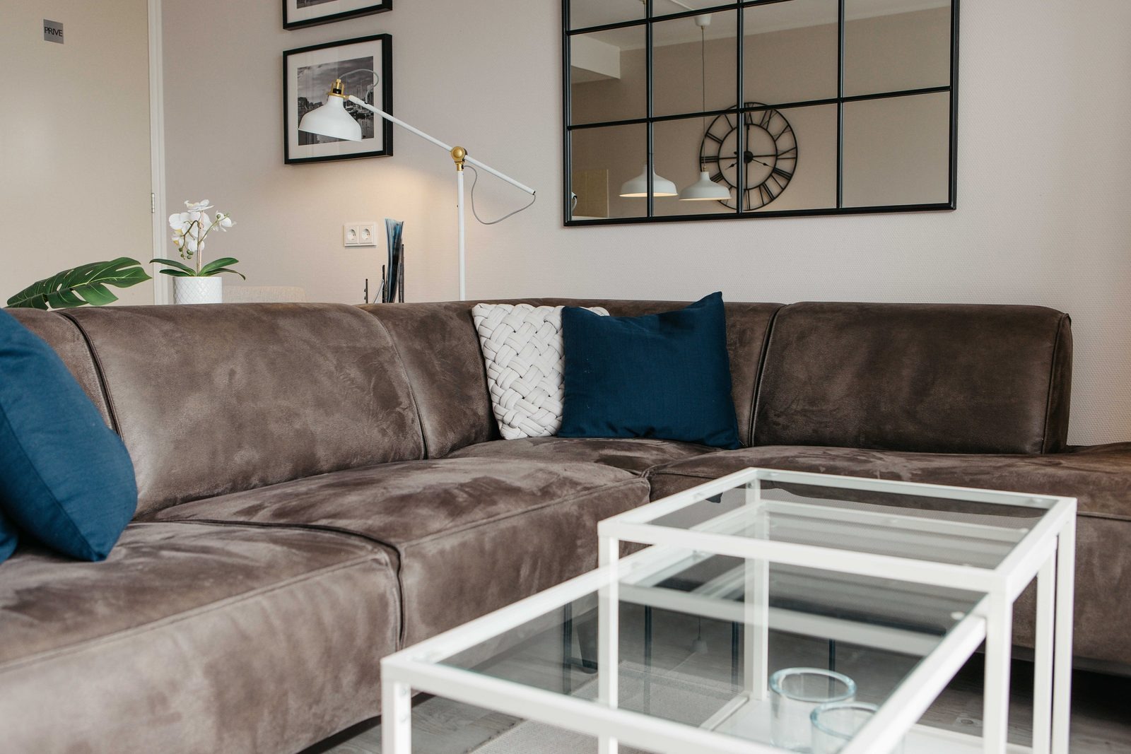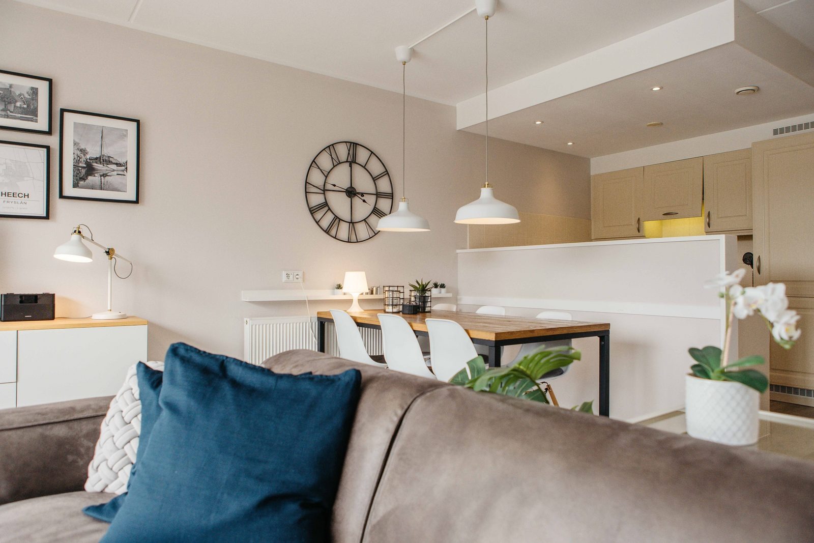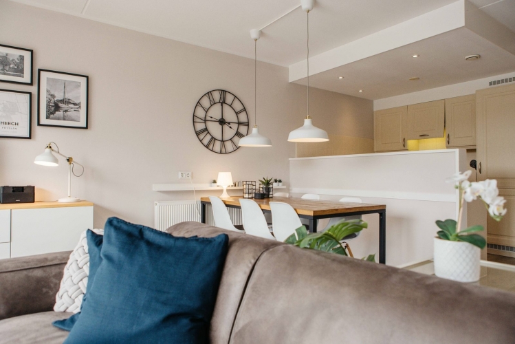 Dieses gekoppelte Ferienhaus für sechs Personen verbindet Komfort mit einer warmen Urlaubsatmosphäre. Das Wohnzimmer verfügt über große Fenster mit Blick auf den lebendigen Binnenhafen, eine komfortable Sitzecke und einen Flachbildfernseher.