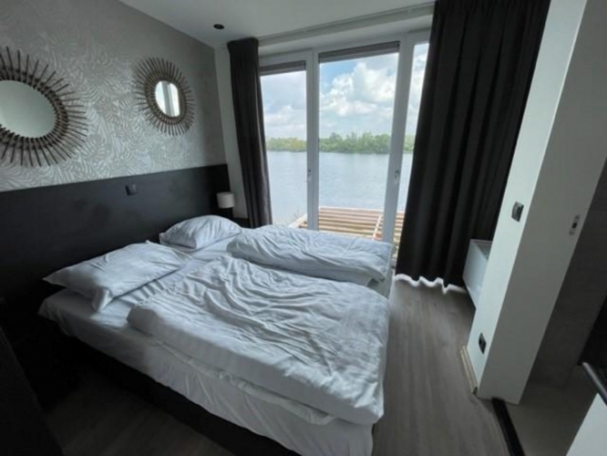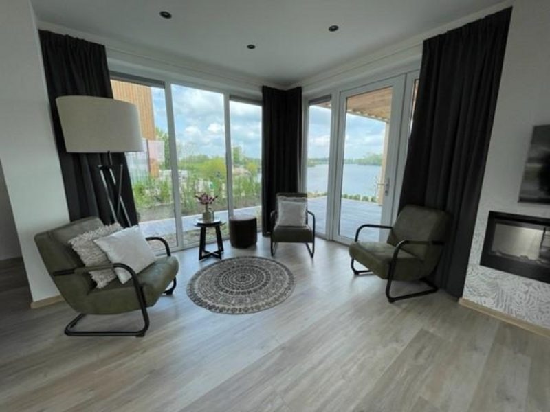 Diese moderne Villa bietet Platz für bis zu acht Personen und verbindet zeitgemäßen Komfort mit einer schönen Lage direkt am Wasser. Das helle Wohnzimmer ist mit einer bequemen Sitzecke, Fernseher und einem stimmungsvollen Kamin ausgestattet und schafft eine warme, einladende Atmosphäre. Große Fensterfronten unterstreichen das großzügige Raumgefühl und bieten Ausblick auf die Umgebung.
