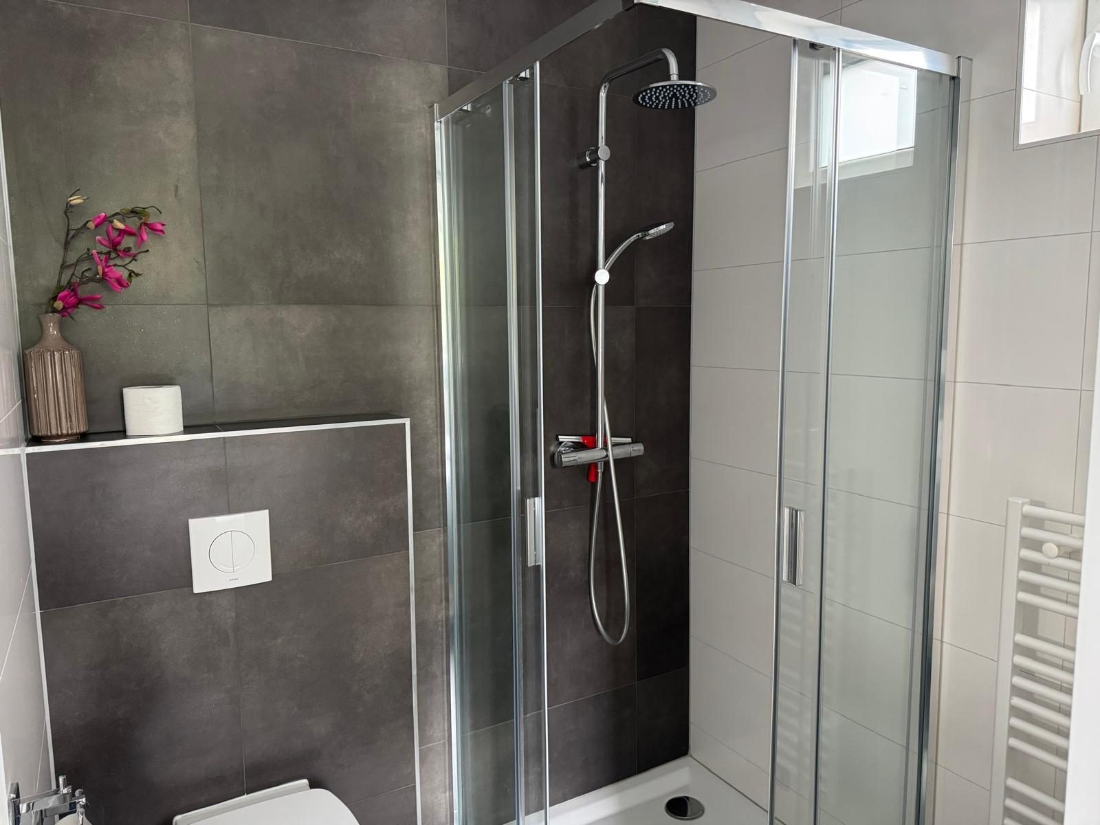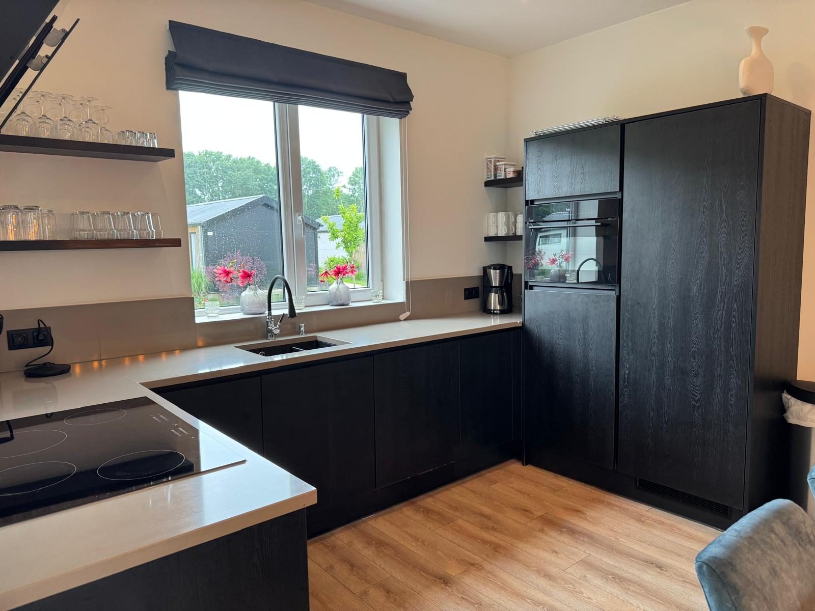 Die offene Küche ist vollständig eingerichtet und ideal für ausgiebiges Kochen und gemeinsames Essen. Zur Ausstattung gehören ein Induktionskochfeld, Backofen, Geschirrspüler, Kühl-Gefrierkombination, Filterkaffeemaschine, Wasserkocher sowie eine komplette Küchenausstattung.