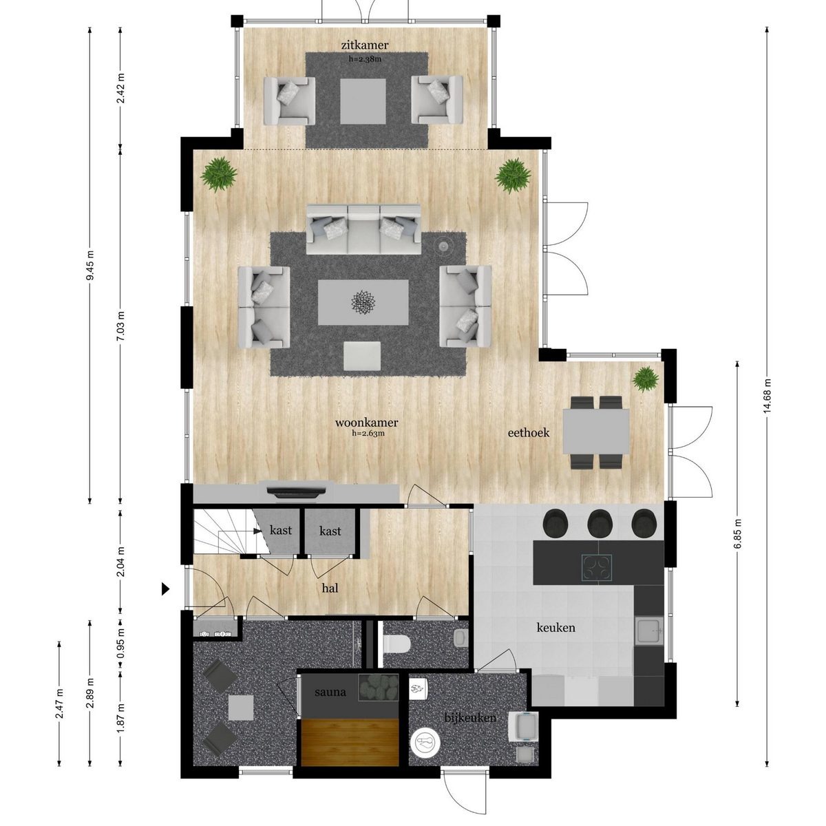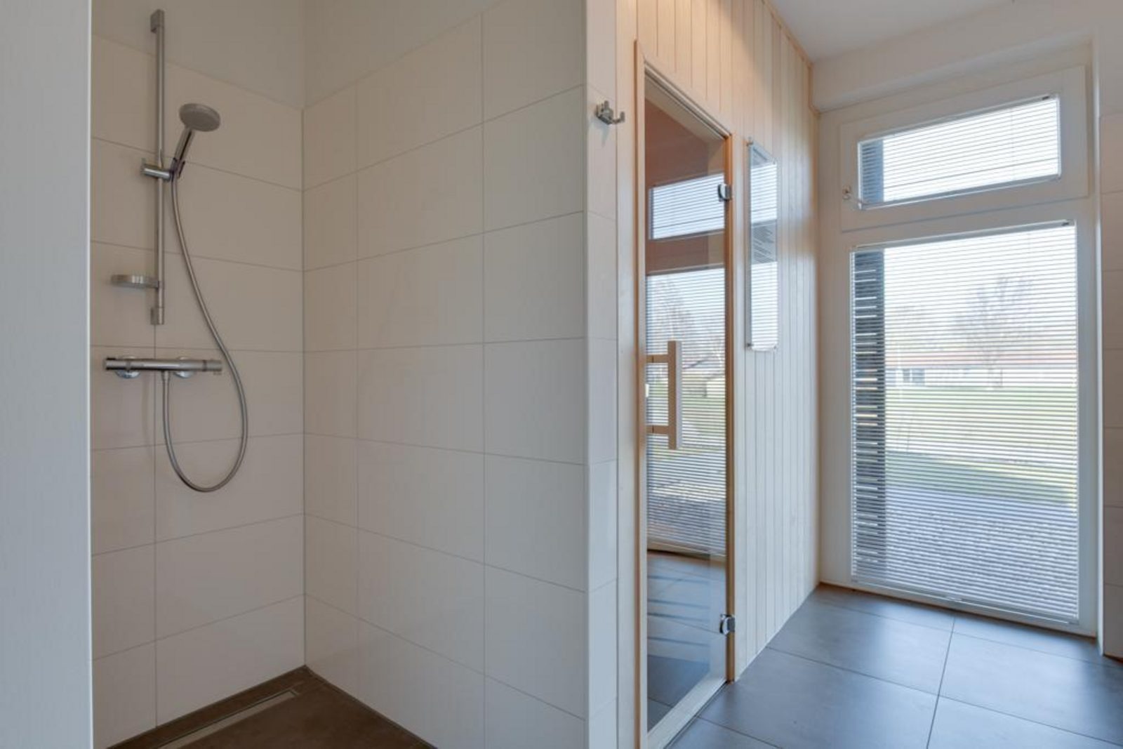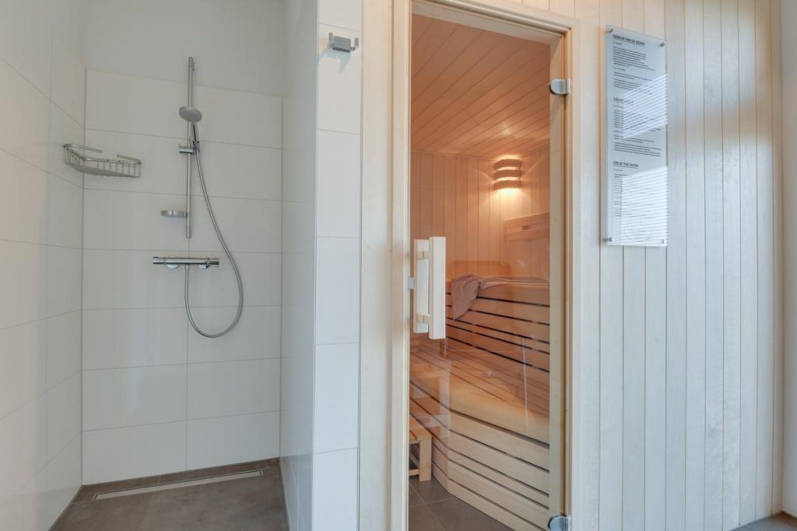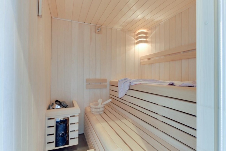 Die offene Küche ist vollständig ausgestattet mit einem 5-Zonen-Cerankochfeld, Kombi-Mikrowelle, Quooker, Geschirrspüler und einer großen Kühl-Gefrierkombination. Die Villa verfügt über drei Badezimmer sowie mehrere WCs im Erd- und Obergeschoss. Im Erdgeschoss befindet sich zudem eine private Sauna mit Dusche.