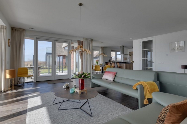 Diese großzügige Villa bietet Komfort und Luxus für bis zu acht Gäste. Das helle Wohnzimmer verfügt über große Fensterfronten und mehrere Sitzecken, sodass jeder einen Platz zum Entspannen oder Zusammensein findet. Der große Esstisch bildet das Herz des Hauses – ideal für lange Abendessen oder gesellige Spieleabende.