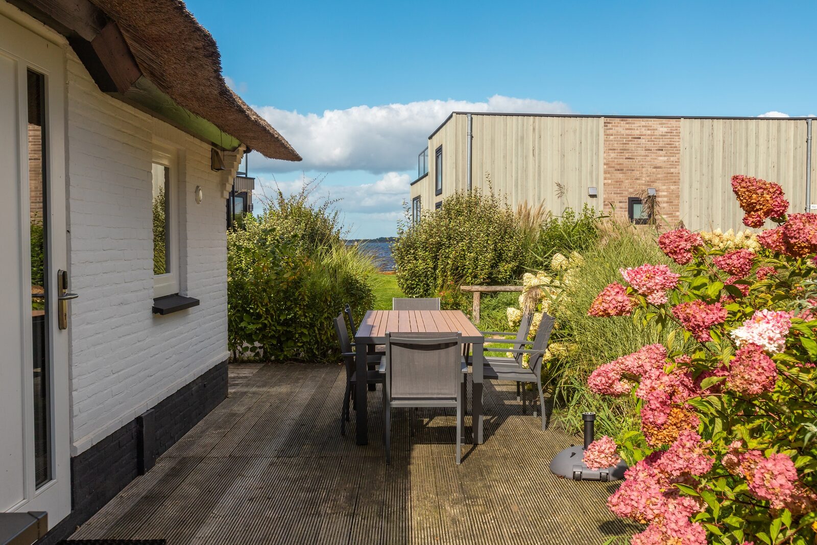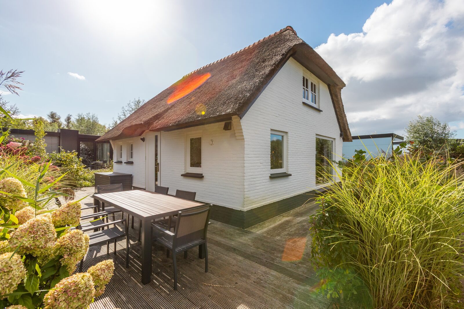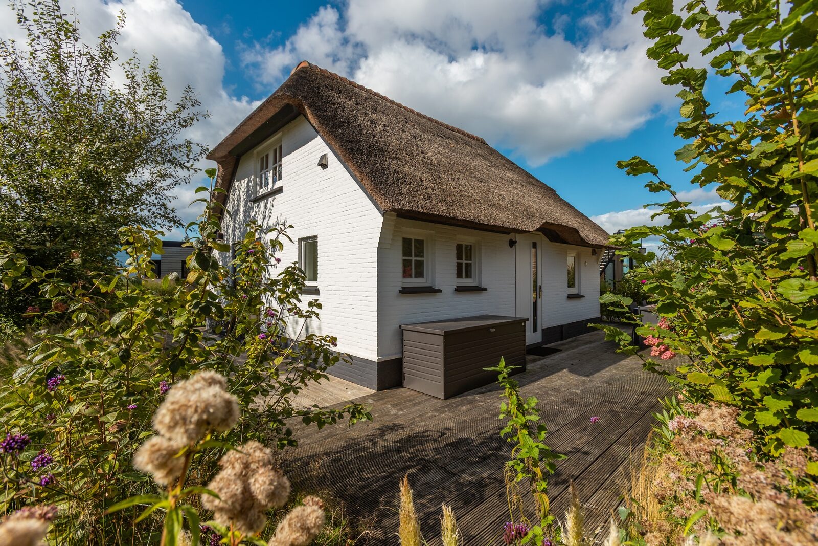 Rund um die Ferienvilla liegt ein großzügiger Garten mit extra großer Terrasse, Veranda, Gartenmöbeln und Sonnenschirm. Hier lässt es sich morgens, mittags und abends angenehm draußen sitzen, während an warmen Tagen auch ausreichend Schatten vorhanden ist. Der Spielplatz ist in kurzer Entfernung erreichbar, Parkplätze befinden sich auf dem zentralen Parkplatz des Parks.