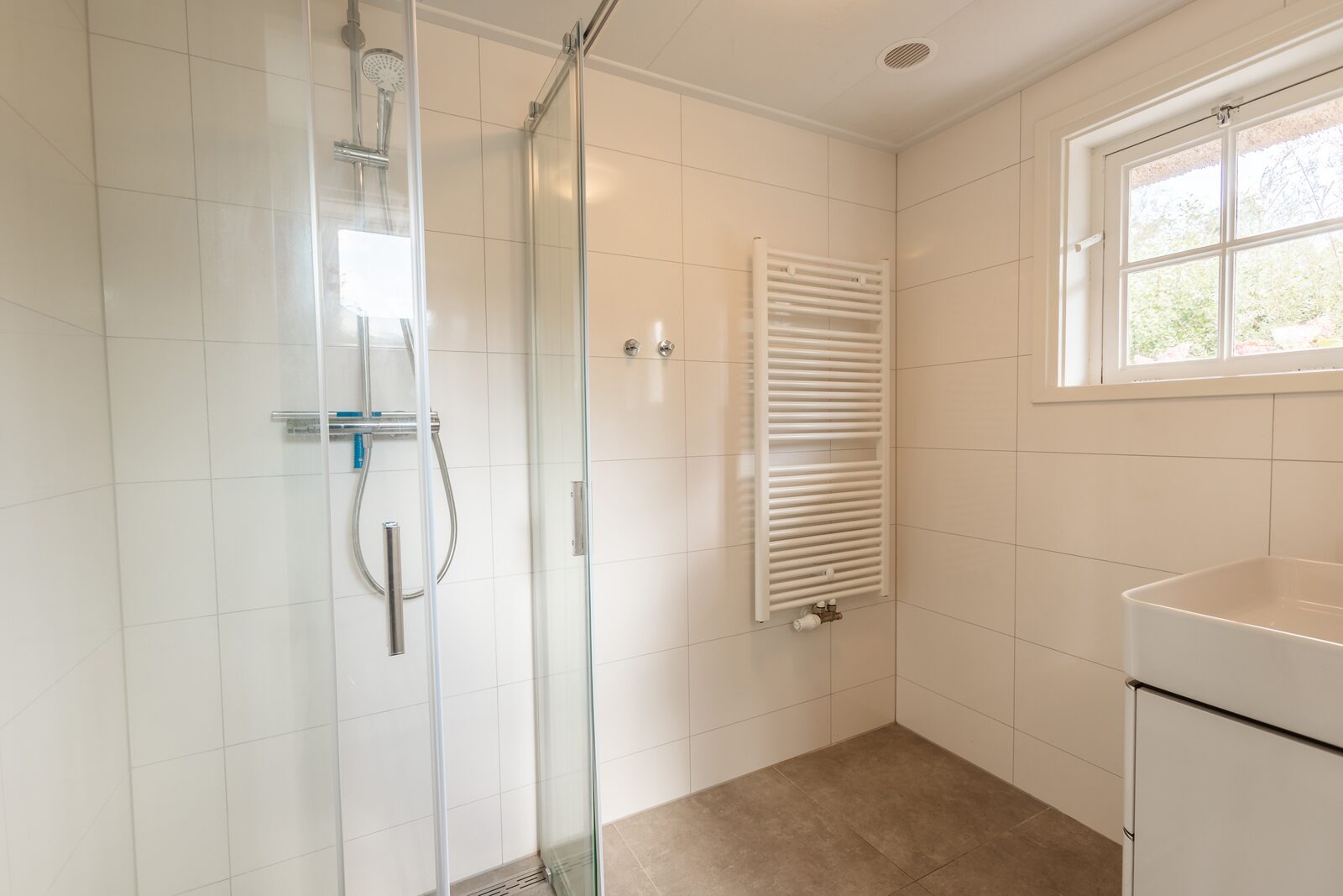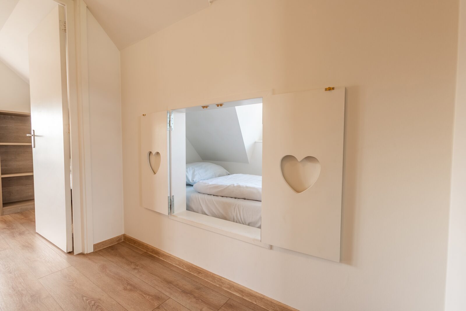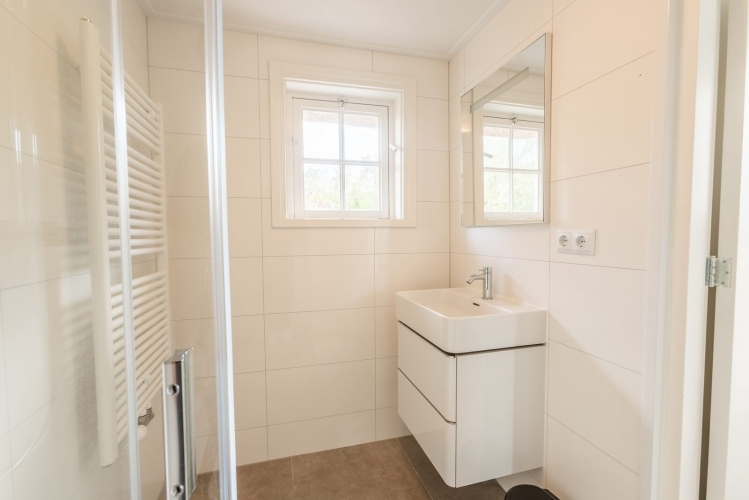 Das Badezimmer befindet sich im Erdgeschoss und verfügt über Dusche und Waschbecken. Zusätzlich gibt es ein separates WC. Im Obergeschoss befinden sich zwei Schlafzimmer sowie eine gemütliche Alkoven-Schlafnische.