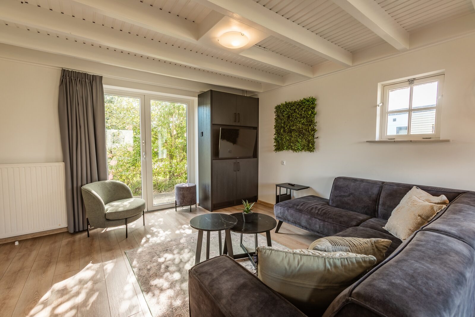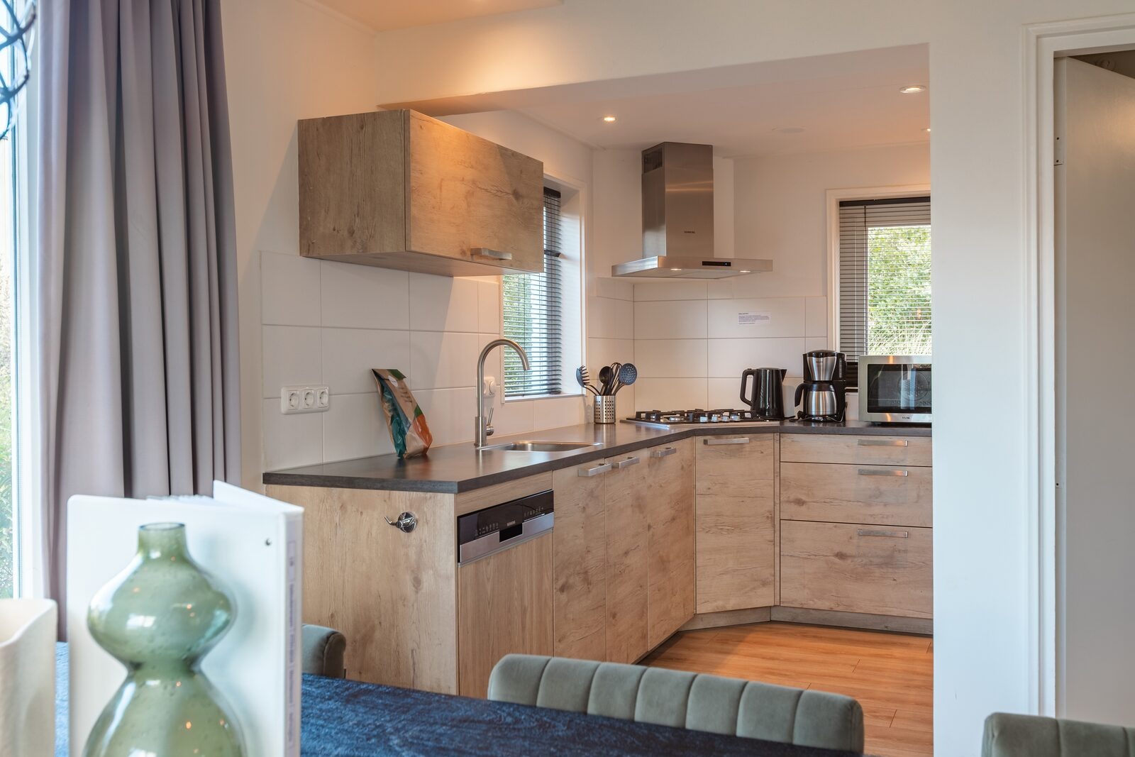 Im Wohnzimmer befindet sich eine Sitzecke mit Smart-TV und WLAN sowie ein separater Essbereich für gemeinsame Mahlzeiten oder Spieleabende. Die Küche ist komplett ausgestattet mit Induktionskochfeld, Kühl-Gefrierkombination, Kombi-Mikrowelle, Backofen, Geschirrspüler, Filterkaffeemaschine und Wasserkocher.
