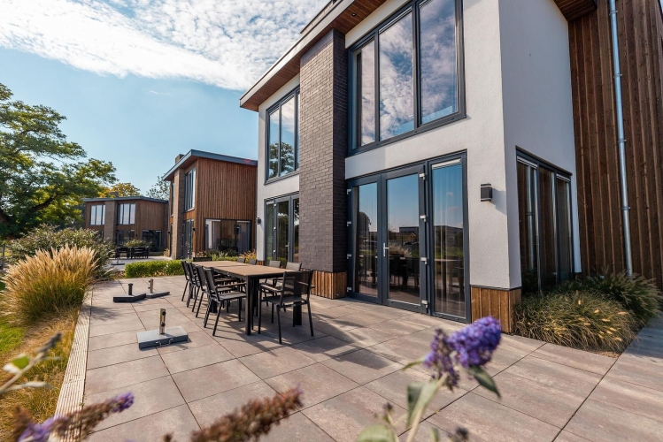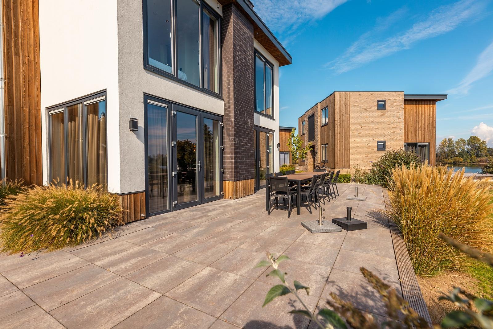 Die Villa verfügt über einen großzügigen Garten sowie eine Terrasse mit Gartenmöbeln und Sonnenschirm. Durch die Ecklage am äußeren Rand des Parks genießen Sie hier zusätzliche Privatsphäre und einen freien Blick auf den Hafen und das Wasser. Die Terrasse ist ein angenehmer Ort zum Verweilen im Freien, mit Blick auf die Boote und die ruhige Umgebung.