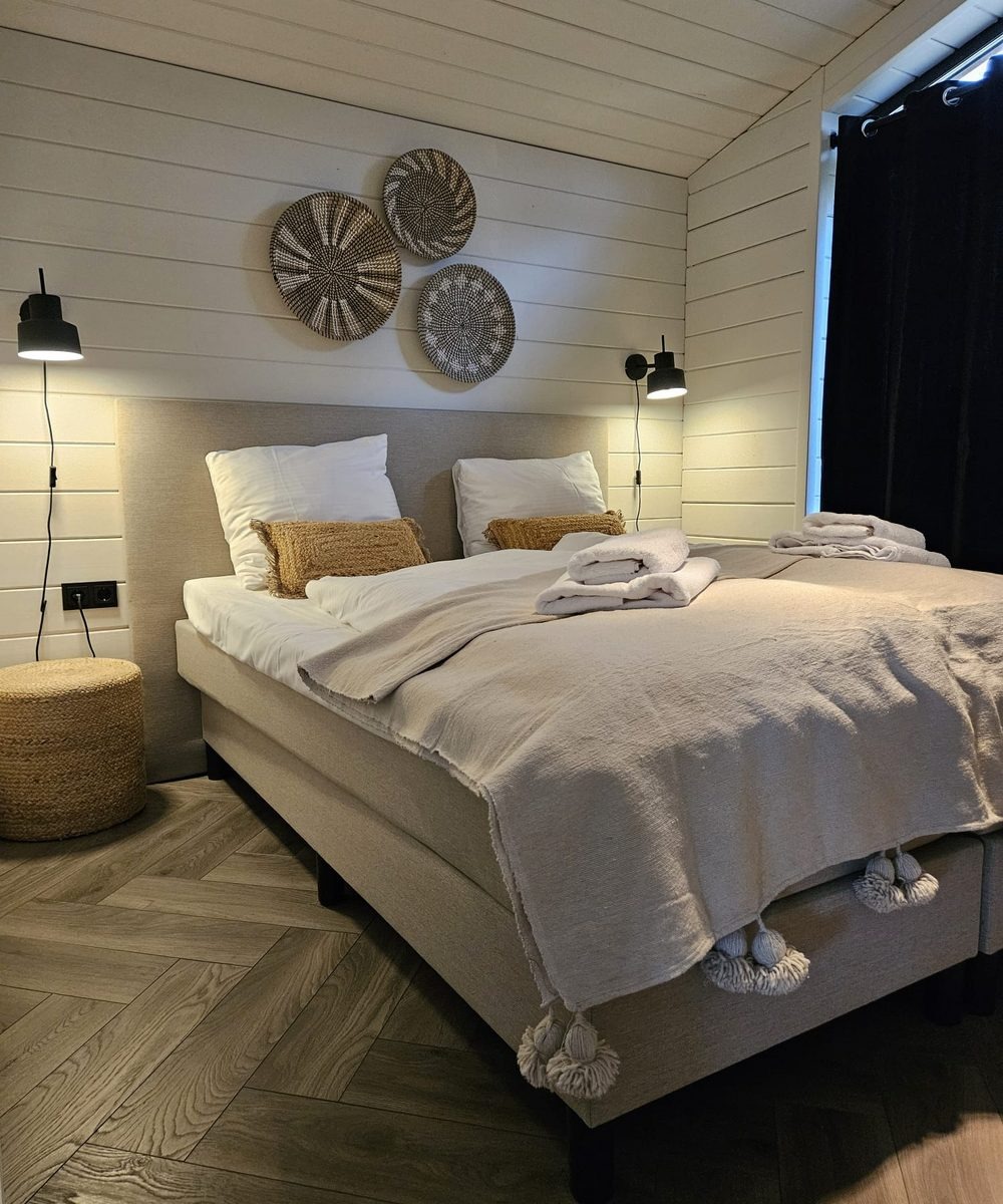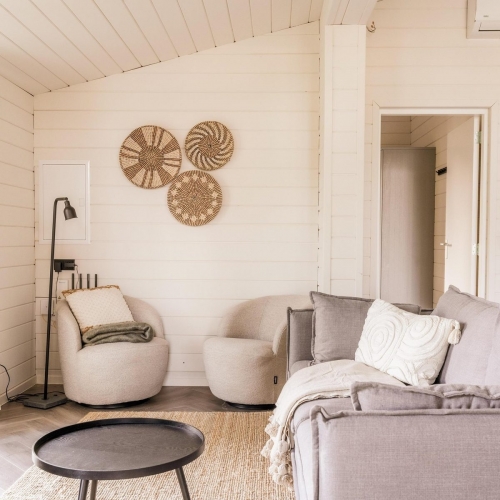 Diese Lodge ist für einen komfortablen Aufenthalt mit Blick auf das Wasser und ruhiger Lage eingerichtet. Große Fenster sorgen für viel Tageslicht und ein offenes Raumgefühl, während Klimaanlage und Holzofen gemeinsam ein angenehmes Raumklima zu jeder Jahreszeit schaffen. Der Wohnbereich besteht aus einer vollständigen Sitzecke mit Fernseher und Sonos-Lautsprecher sowie einem großzügigen Essbereich für gemeinsame Momente.