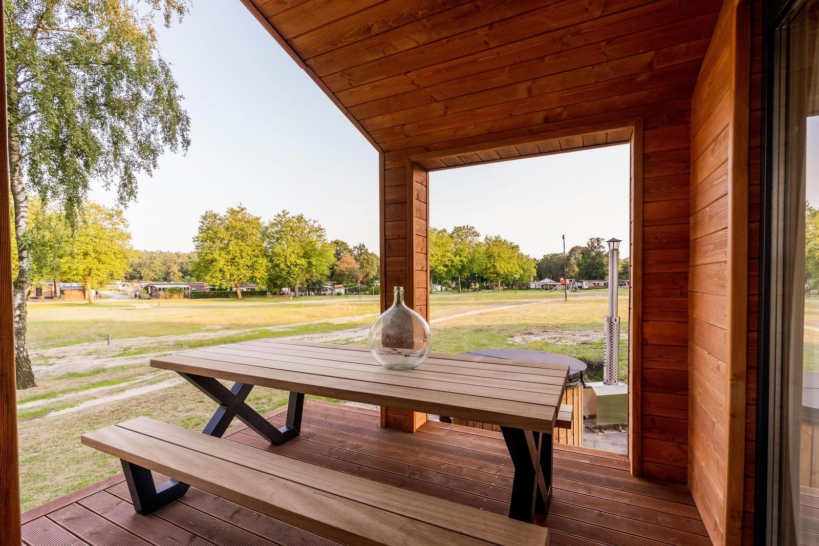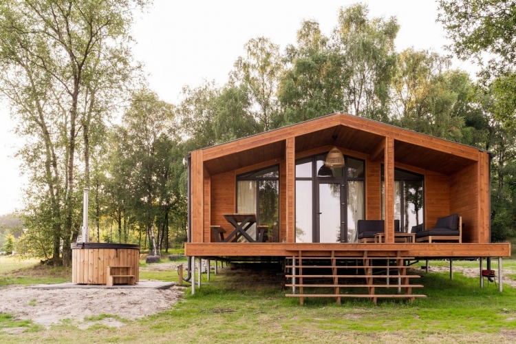 Die Lodge befindet sich auf einem weitläufig angelegten Gelände, auf dem sich Wasserflächen und Grün abwechseln. Die Anlage ist offen und ruhig gestaltet, mit ausreichend Abstand zwischen den Unterkünften. Spielmöglichkeiten und Freizeiteinrichtungen sind fußläufig erreichbar, wodurch sich die Unterkunft sowohl für Familien als auch für Paare eignet.