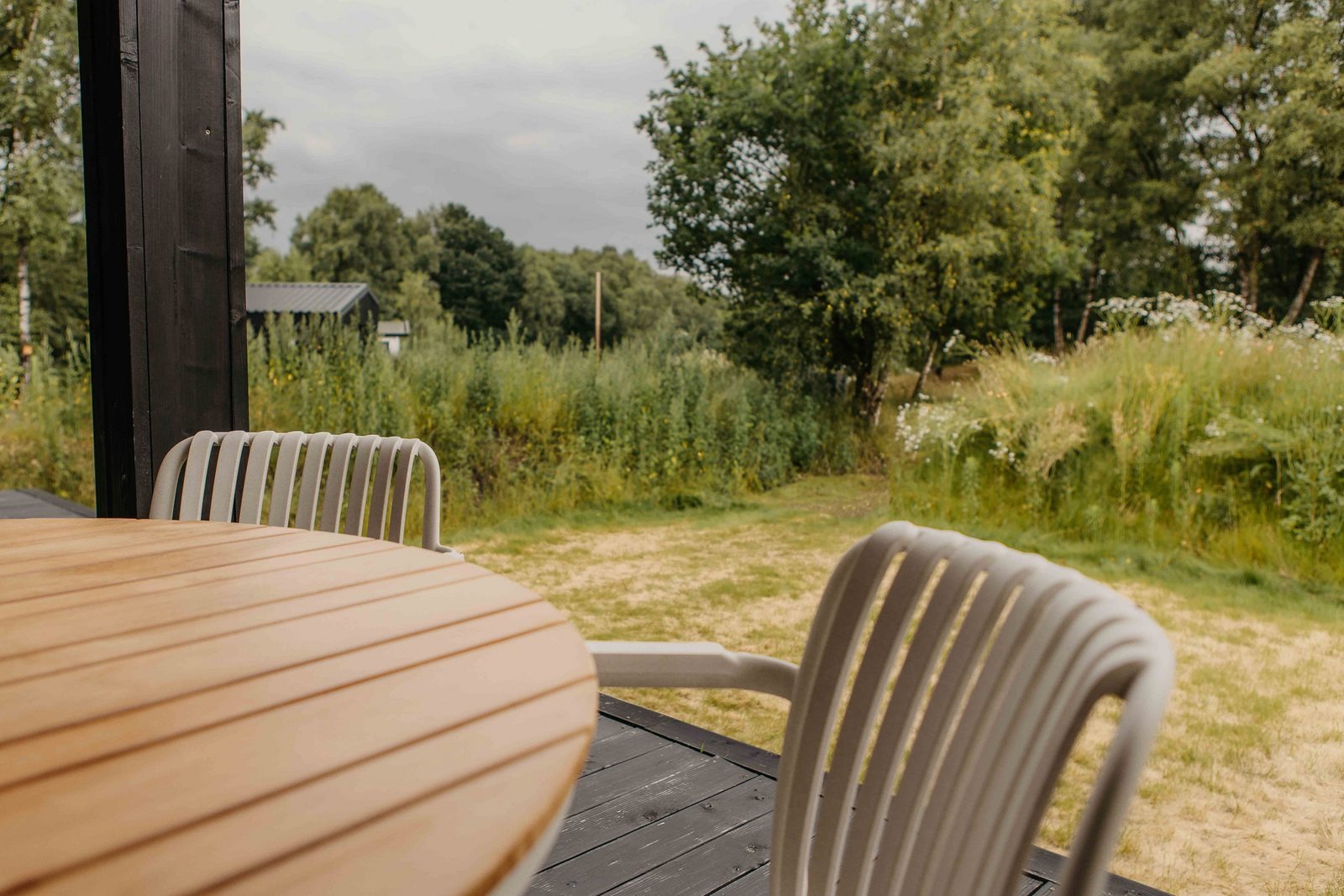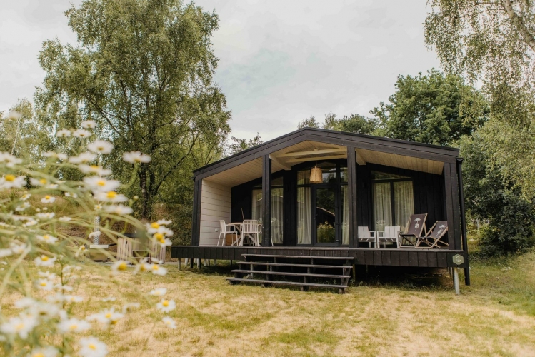 Die Lodge liegt geschützt und bietet einen freien Blick auf Wald und weite Felder. Auf der überdachten Holzveranda stehen eine gemütliche Lounge sowie ein Esstisch mit Stühlen zur Verfügung – ideal, um die Abendsonne zu genießen. Direkt von der Lodge aus führen Wanderwege durch die umliegende Natur mit sanften Hügeln und weiten Ausblicken.