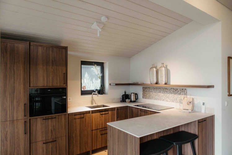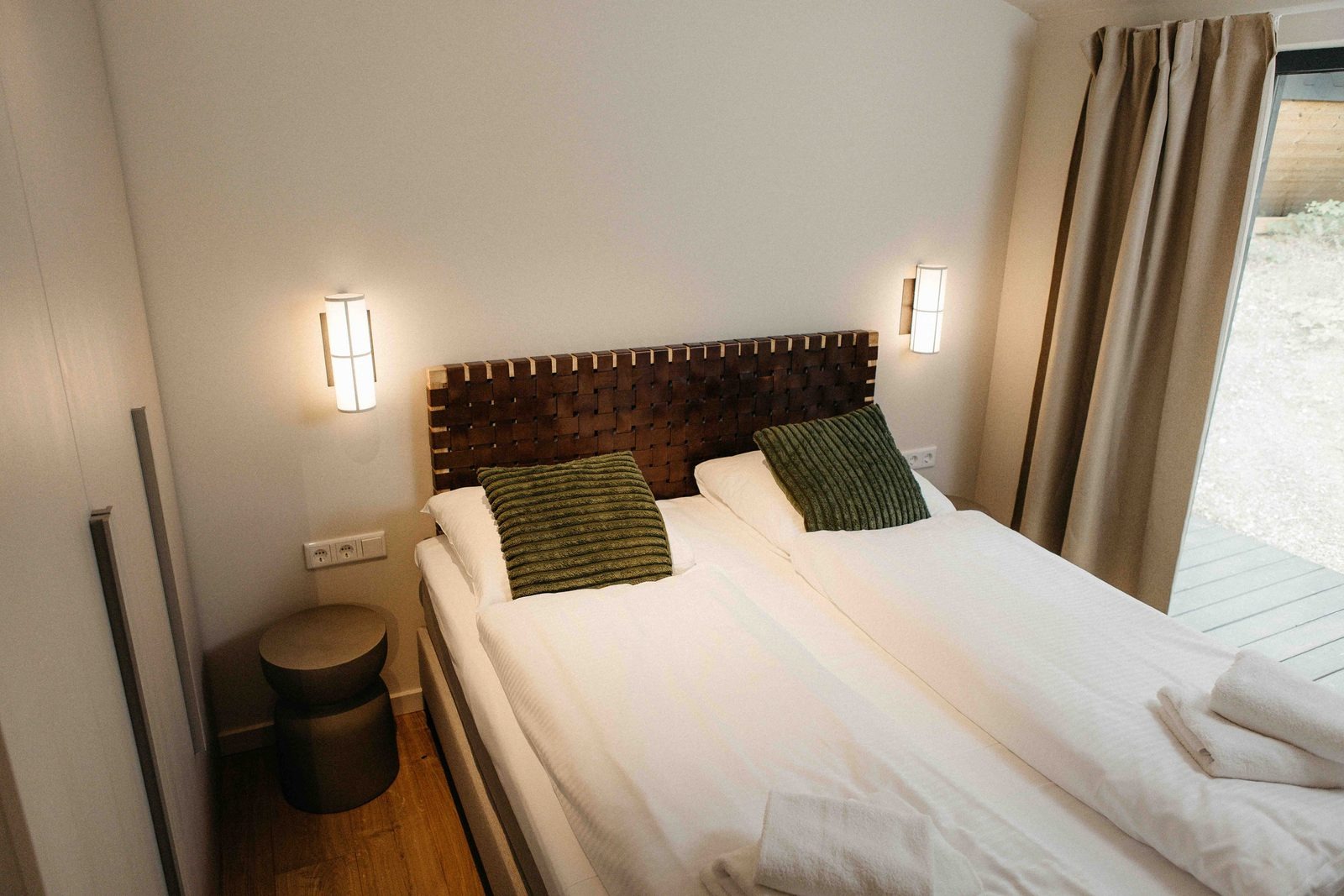 Diese moderne, ökologisch gebaute Lodge verbindet eine natürliche Optik mit zeitgemäßem Komfort. Das Sedumdach sorgt für eine nachhaltige Isolierung und fügt sich harmonisch in die Umgebung ein. Der Wohnbereich ist hell und großzügig gestaltet und verfügt über einen Essbereich, einen TV sowie eine Klimaanlage zum Kühlen und Heizen.