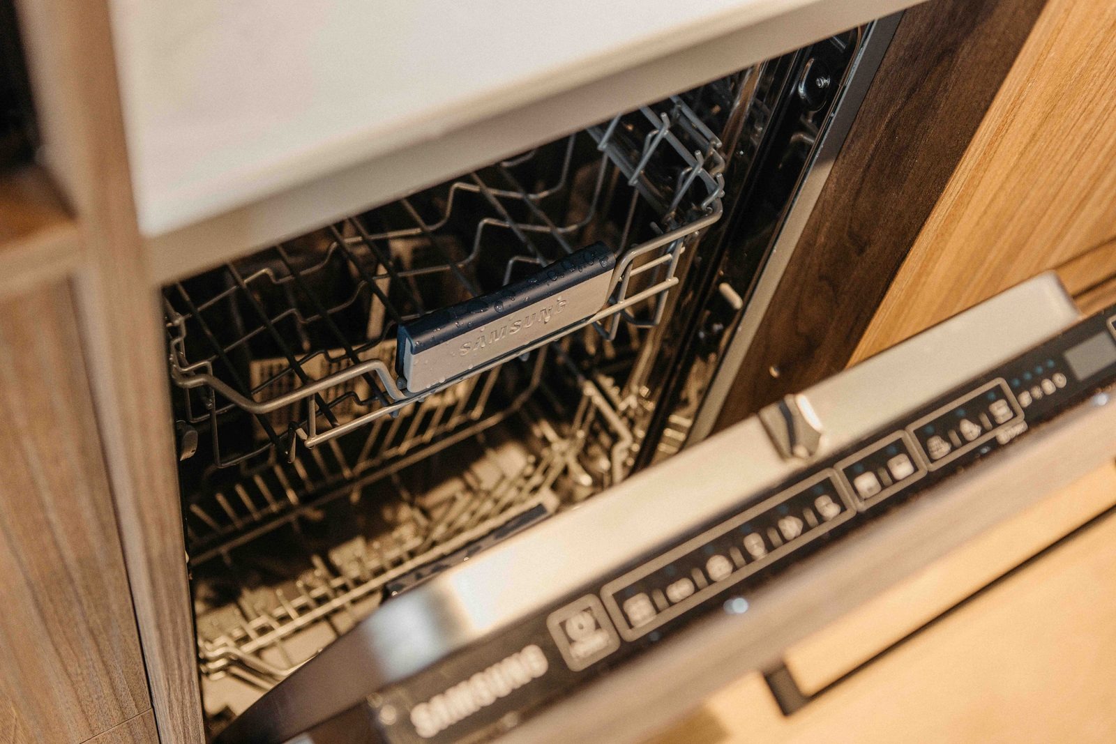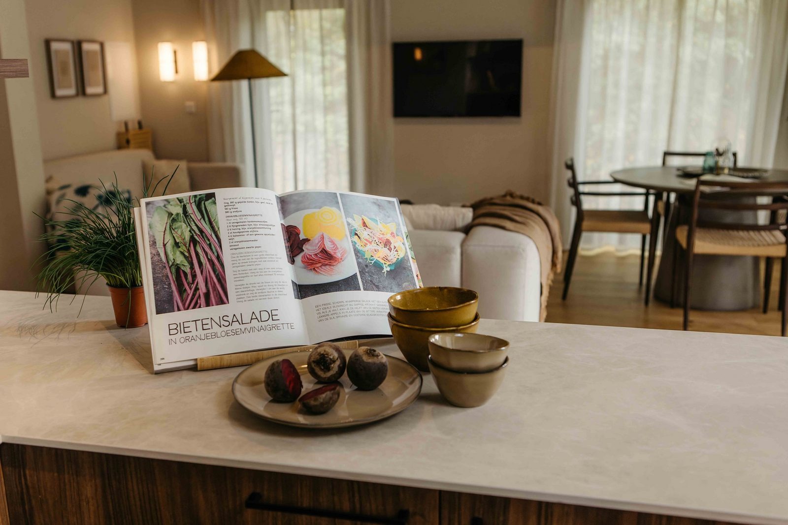 Im Inneren ist die Lodge hell und stimmungsvoll eingerichtet. Der Wohnbereich verfügt über eine bequeme Sitzecke mit Fernseher sowie einen Essbereich für gemeinsame Mahlzeiten. Durch die Klimaanlage (Kühlen und Heizen) ist das Raumklima zu jeder Jahreszeit angenehm. Die offene Küche ist vollständig ausgestattet, unter anderem mit Nespresso-Maschine, Geschirrspüler, Kühlschrank mit Gefrierfach, Kombi-Mikrowelle, Backofen, Wasserkocher sowie einer kompletten Küchenausstattung.