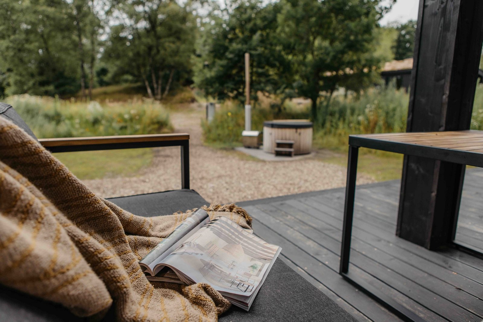 Im Außenbereich steht Entspannung im Mittelpunkt. Die Lodge verfügt über einen privaten Hot Tub, geschützt zwischen den Bäumen, in dem Sie die Ruhe und Natur genießen können. Die großzügige, überdachte Holzveranda ist mit Esstisch und Loungeset ausgestattet und bietet sowohl Sonnen- als auch Schattenplätze. Dank der Nähe zu Wanderwegen starten Sie direkt von der Lodge aus in die Natur.