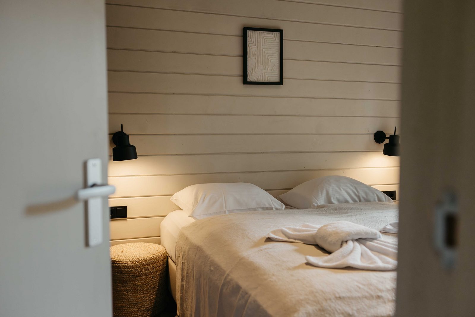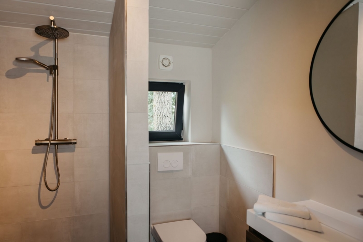 Das Badezimmer verfügt über eine Regendusche, Waschbecken und WC. Die Betten sind bei Ankunft bezogen und pro Person ist ein Handtuchset inklusive.