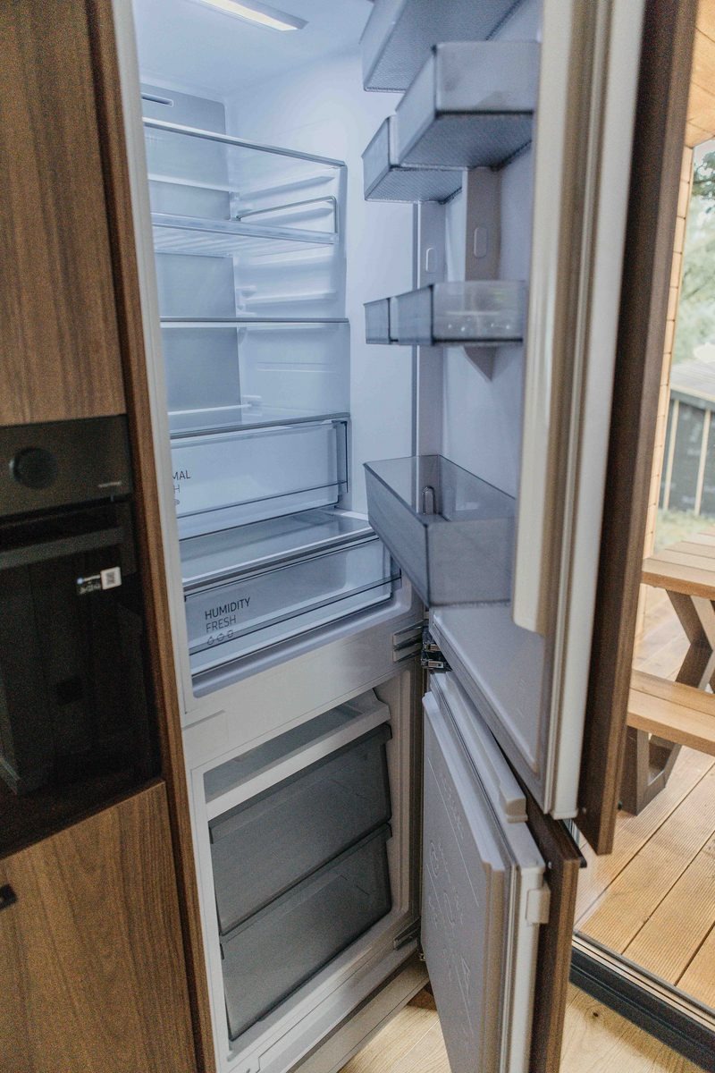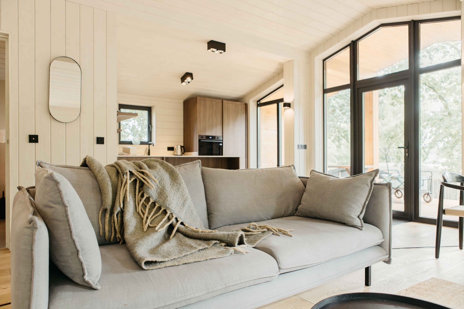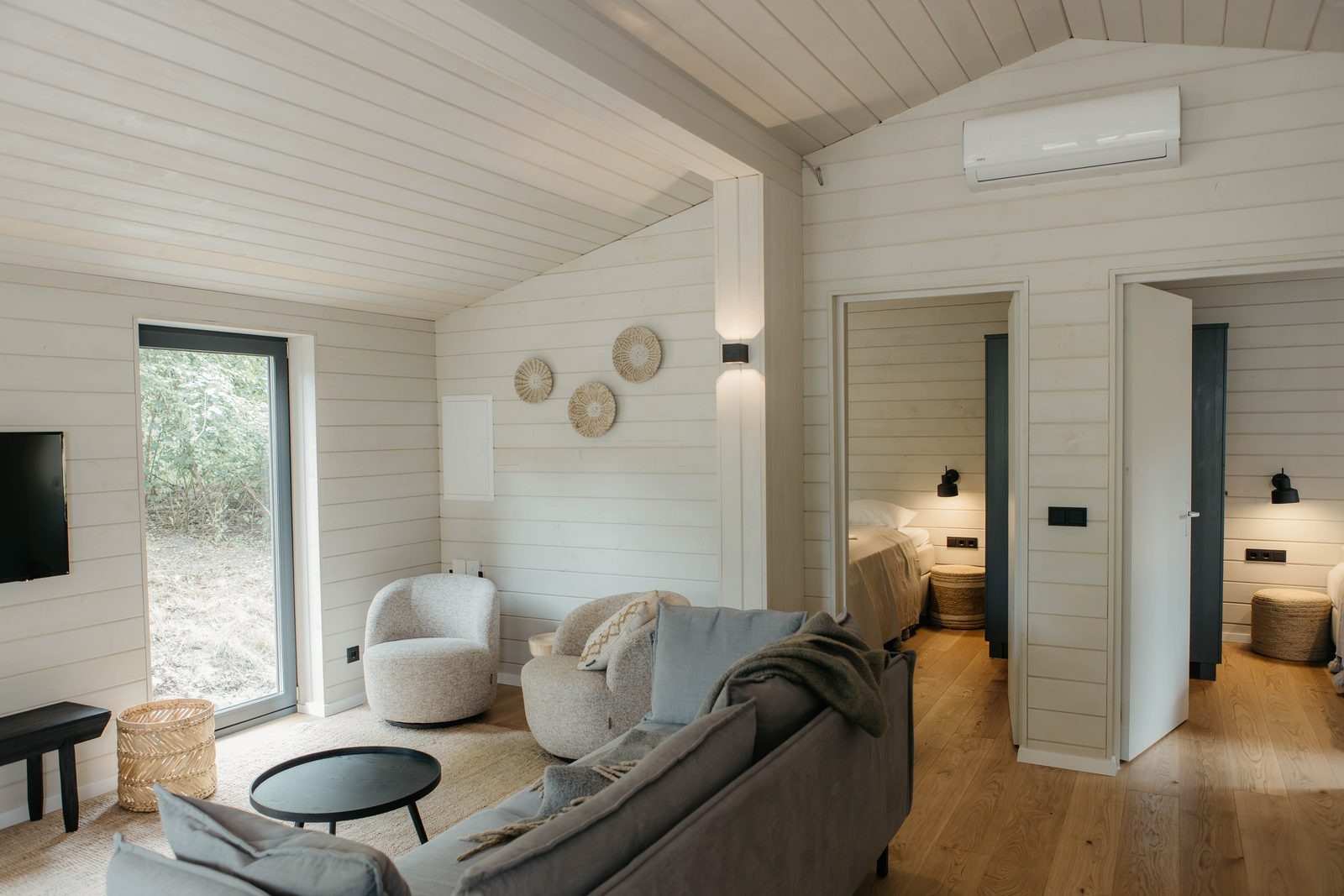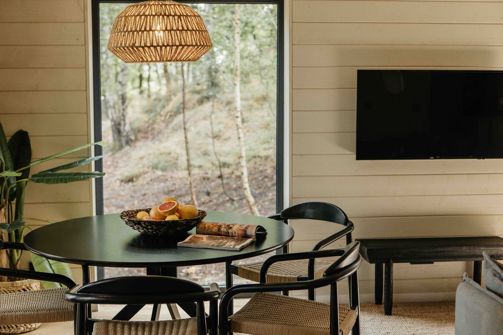 Diese Lodge ist ideal für alle, die Komfort und Ruhe in naturnaher Umgebung miteinander verbinden möchten. Große Fenster sorgen für viel Tageslicht und einen freien Ausblick, während die gemütliche Sitzecke und der Essbereich einen angenehmen Ort zum gemeinsamen Entspannen bieten.