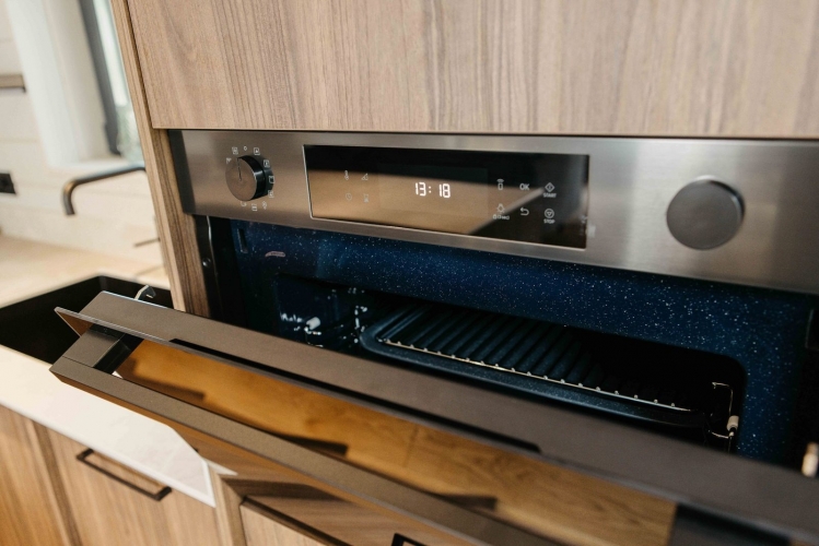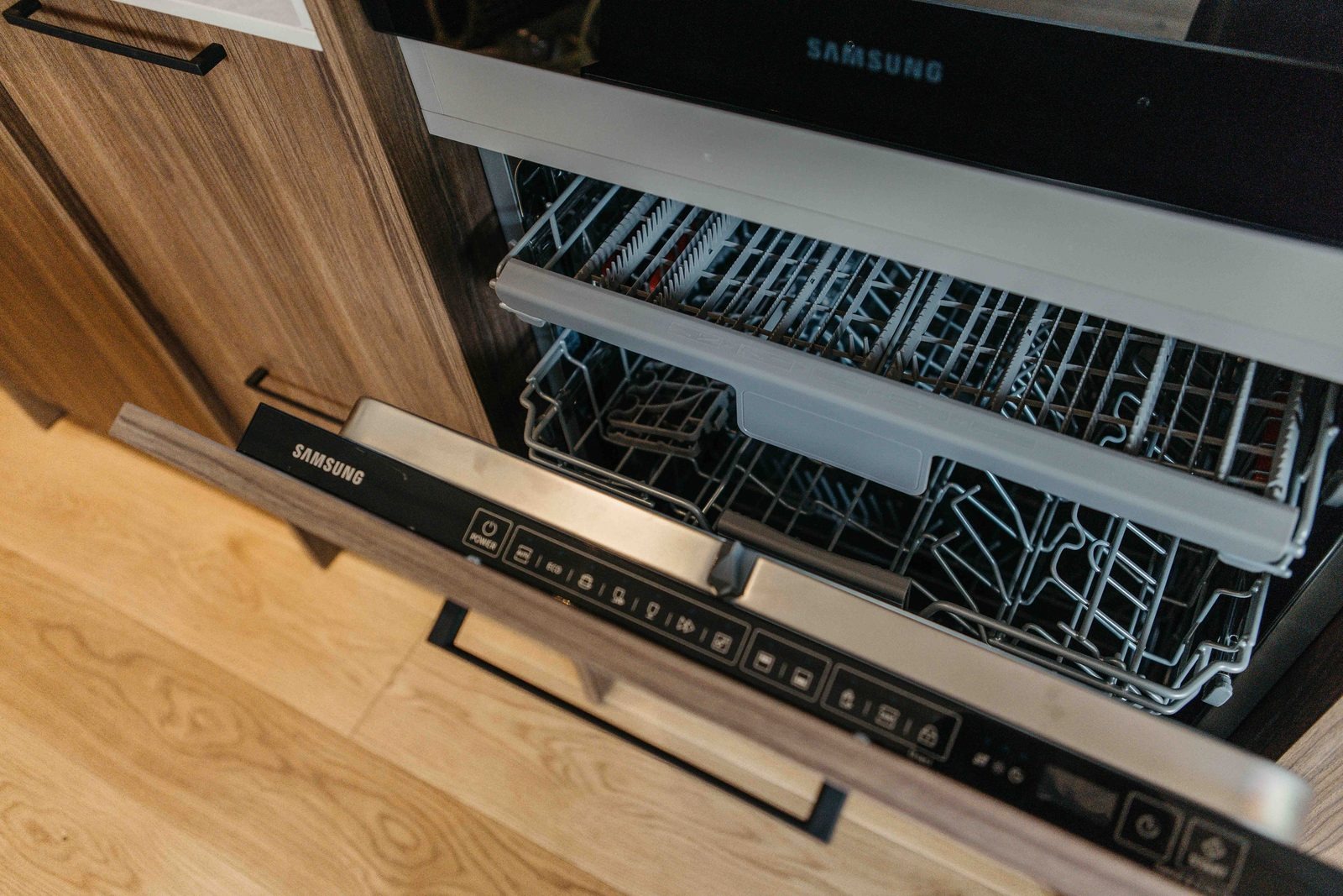 Die offene Küche ist vollständig ausgestattet mit Kühl- und Gefrierschrank, Kombimikrowelle, Backofen, Geschirrspüler, Nespresso-Kaffeemaschine, Toaster, Wasserkocher sowie kompletter Küchenausstattung. So lässt sich bequem selbst kochen und gemeinsam genießen.