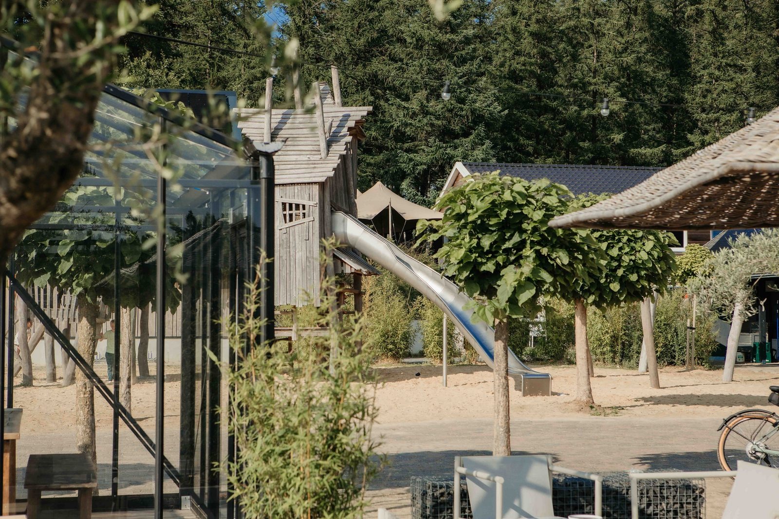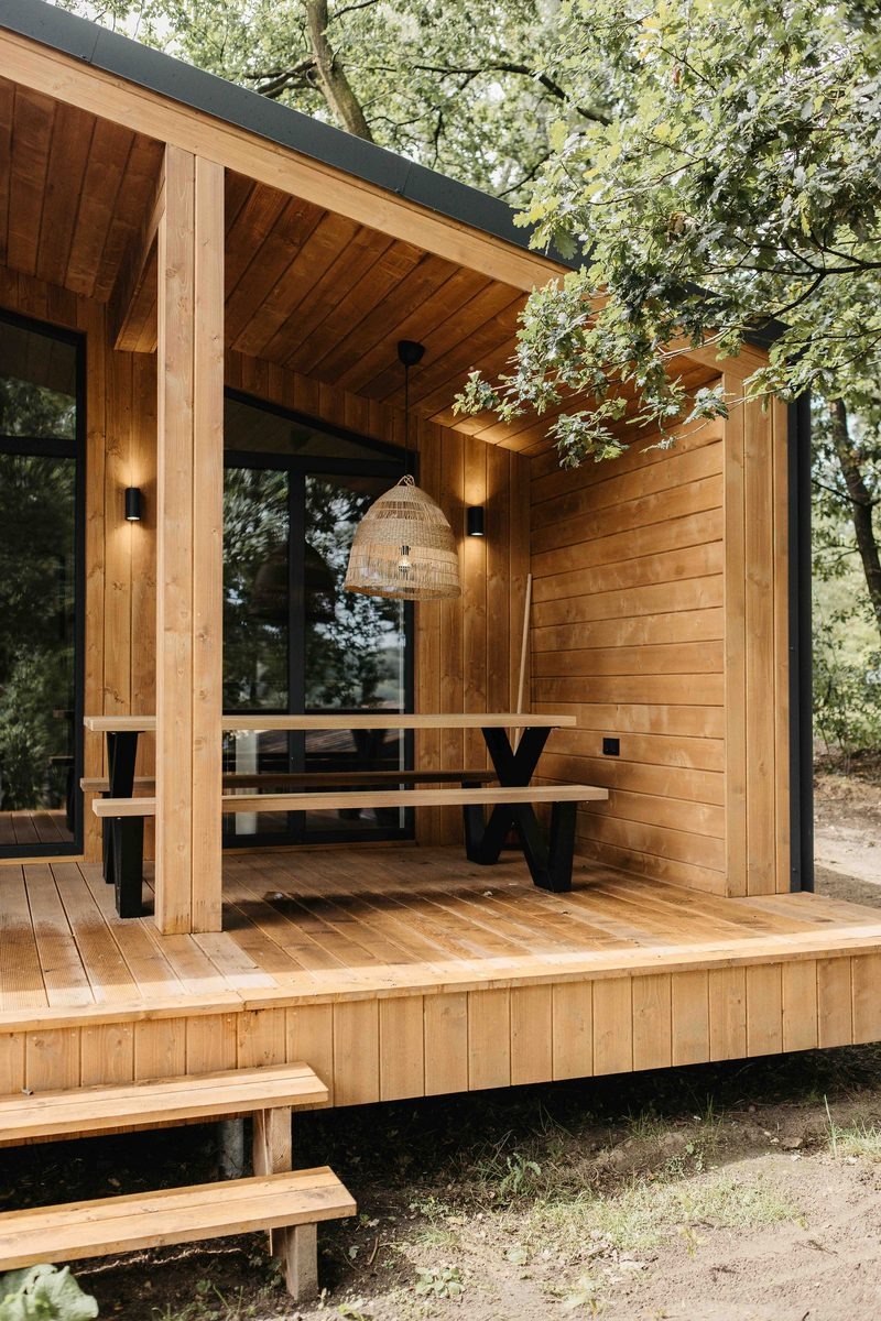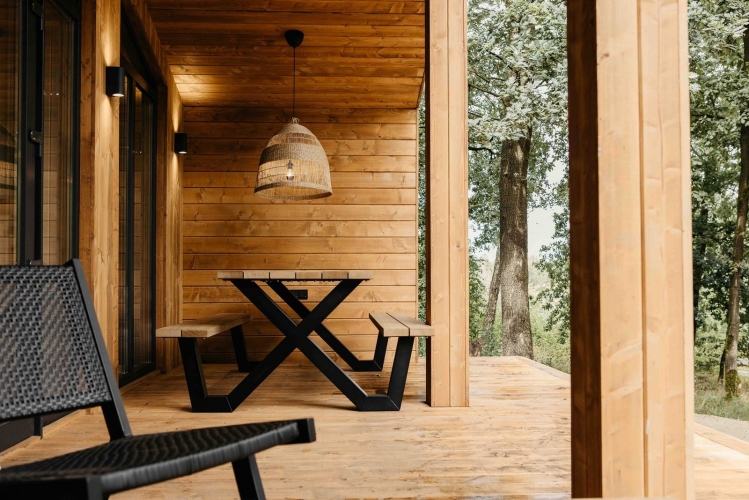 Die Lodge liegt geschützt im Grünen und bietet sowohl Morgensonne als auch schattige Plätze im Tagesverlauf. Die überdachte Holzveranda bildet einen harmonischen Übergang zwischen Innen- und Außenbereich. Hier lässt sich in aller Ruhe frühstücken oder gemeinsam an der Picknicktafel die frische Luft genießen.