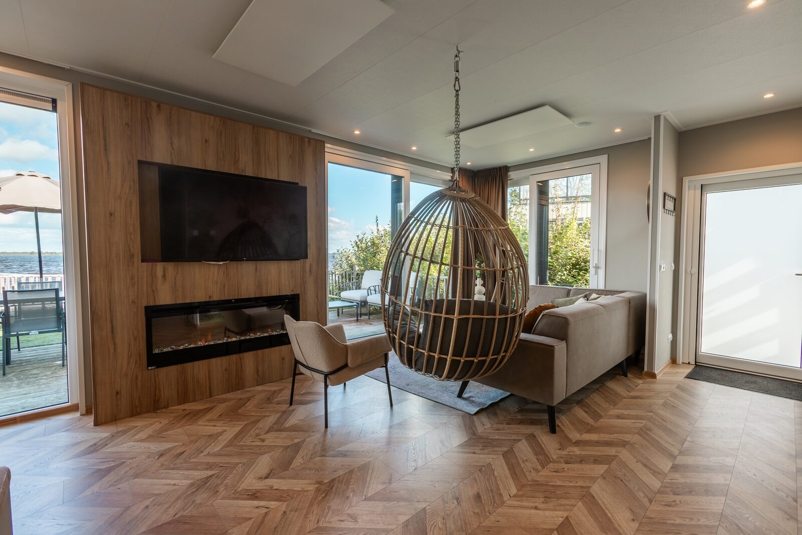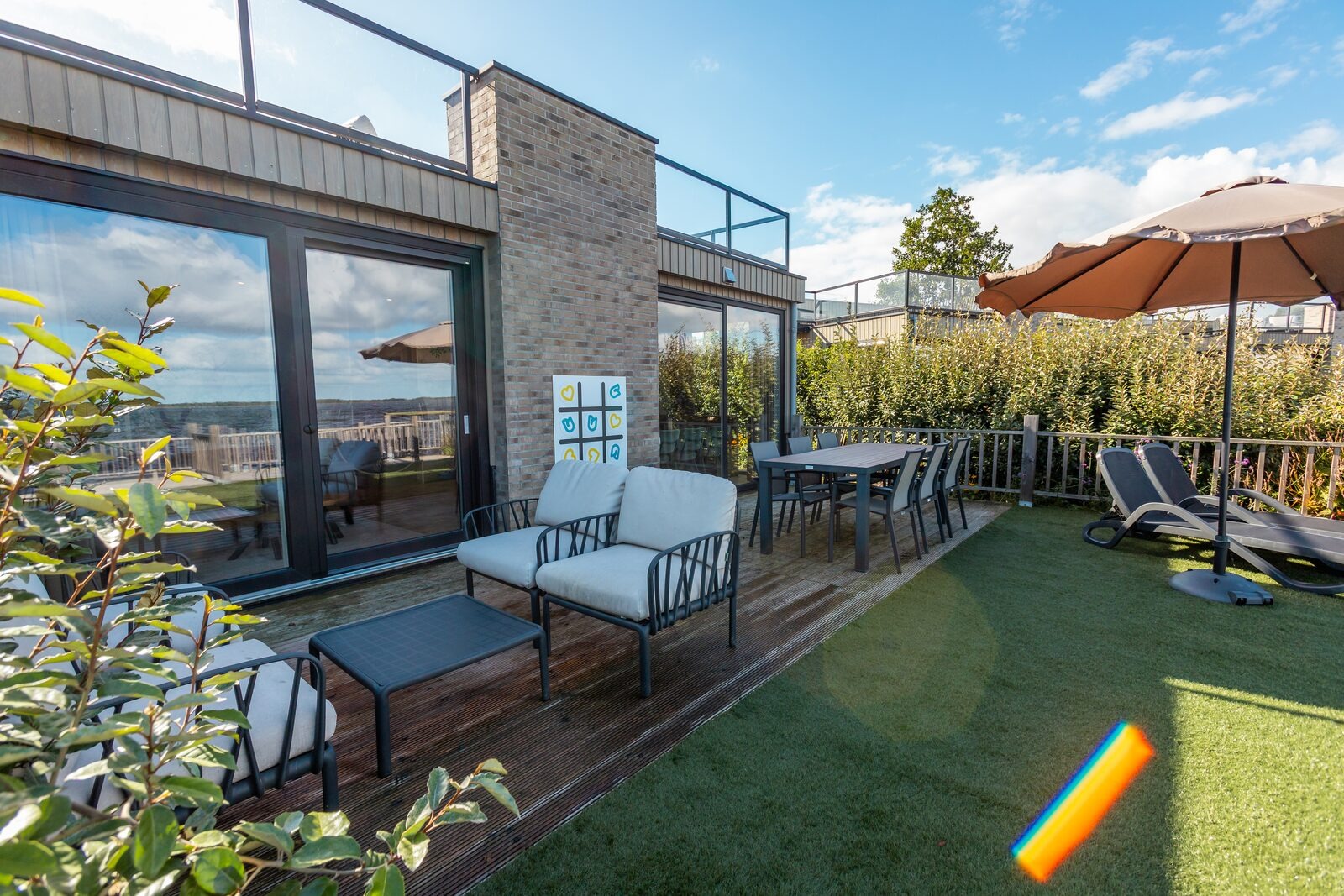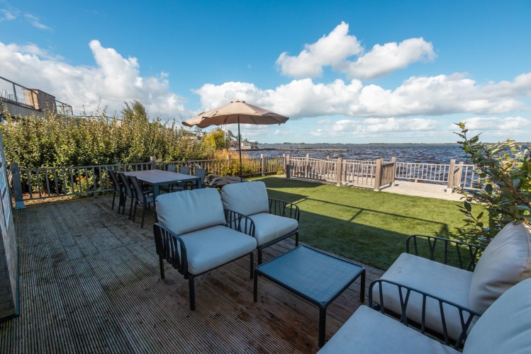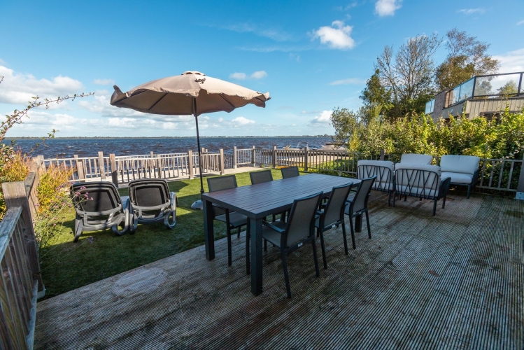 Zum Ferienhaus gehört ein eingezäunter Garten mit großer Terrasse sowie eine Dachterrasse mit Lounge-Möbeln und Liegestühlen. Der eigene Steg am Wasser lädt dazu ein, direkt am Haus Zeit am Wasser zu verbringen oder aufs Wasser zu gehen. Durch die Lage am Rand des Parks gibt es tagsüber viel Sonne und ausreichend Privatsphäre.