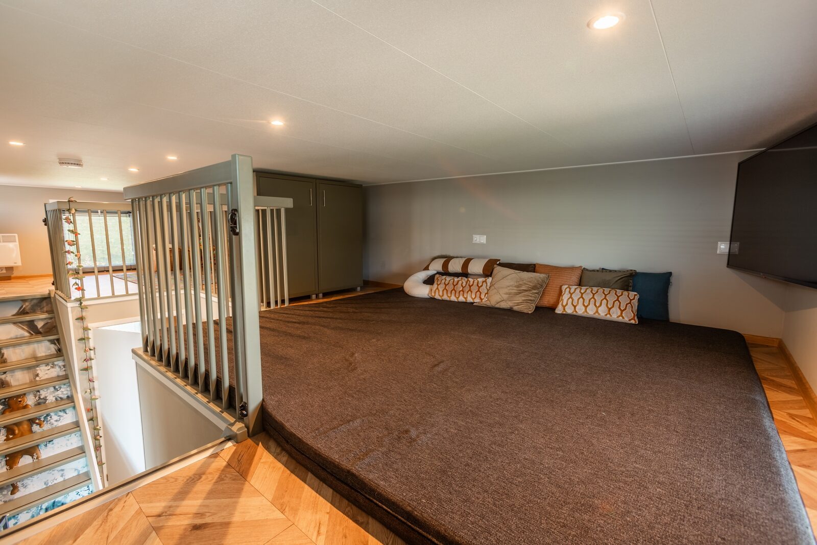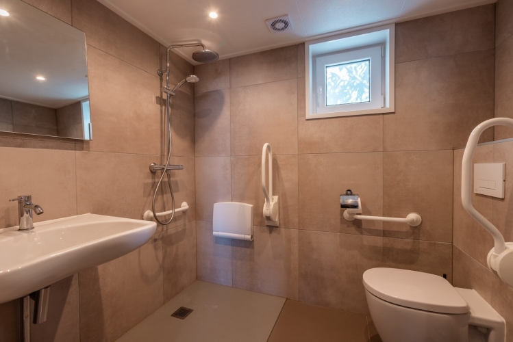 Das Badezimmer im Erdgeschoss ist barrierefrei gestaltet und mit Haltegriffen an Toilette und Dusche ausgestattet. Zusätzlich steht ein separates WC zur Verfügung. Das Ferienhaus verfügt über zwei Schlafzimmer im Erdgeschoss sowie eine Galerie mit zusätzlichem Schlaf- und Spielbereich.