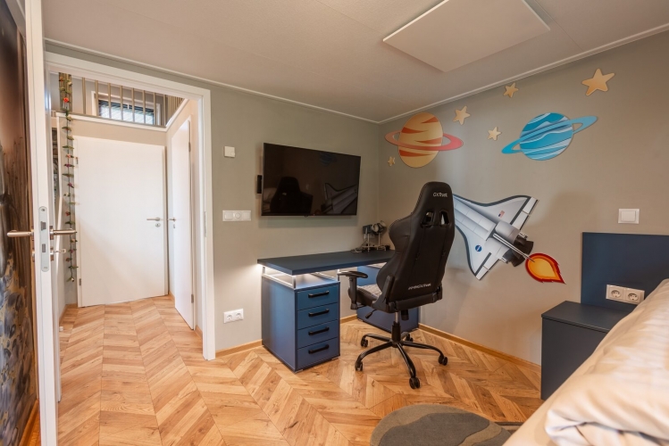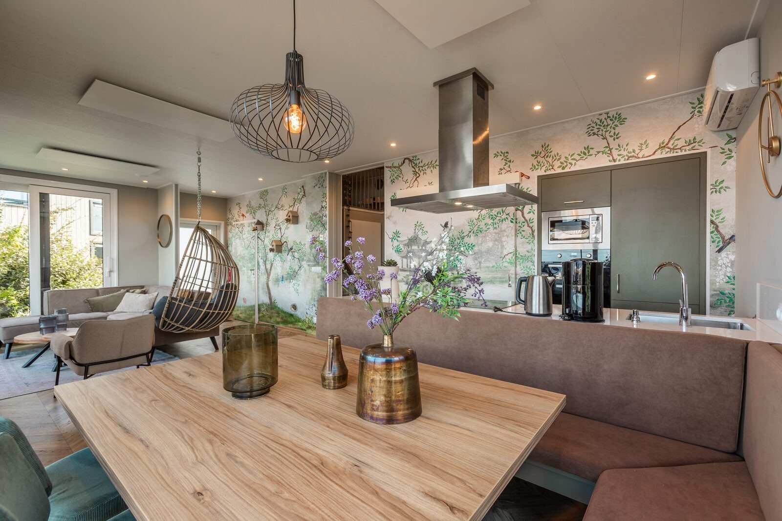 Das Ferienhaus ist großzügig gestaltet und verfügt über Zentralheizung, Infrarotheizung, Klimaanlage sowie einen Kamin. Im Wohnbereich befinden sich eine Sitzecke mit Smart-TV und Soundsystem sowie ein großer Esstisch für gemeinsame Mahlzeiten. Die offene Küche ist komplett ausgestattet mit Kochinsel, Induktionskochfeld, Backofen, Kombi-Mikrowelle, Geschirrspüler, Kühlschrank mit Gefrierfach, Wasserkocher und Nespresso-Kaffeemaschine.