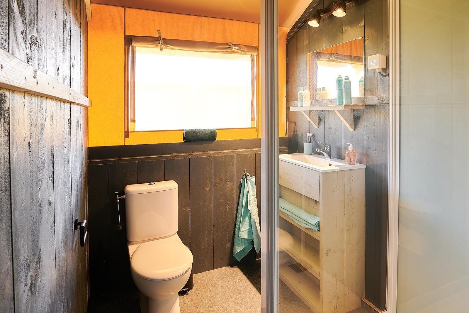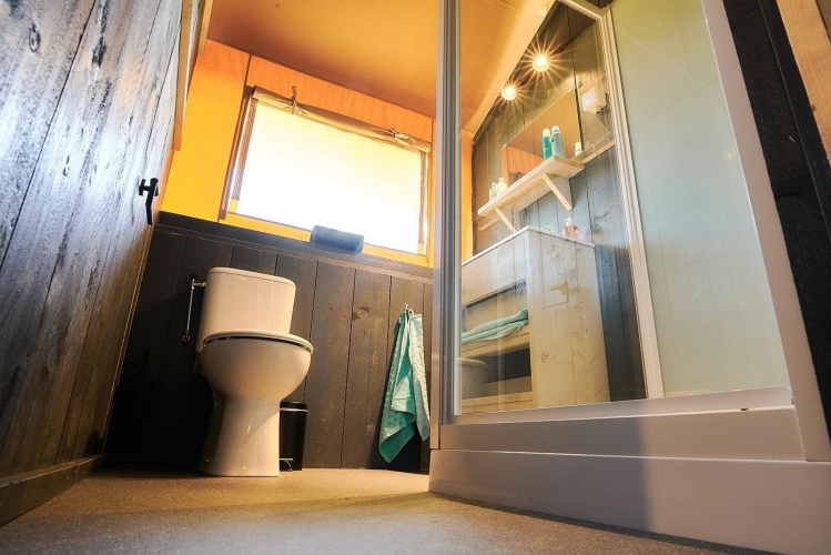Genießen Sie dieses luxuriöse Safarizelt mit eigenem Sanitärbereich und großzügiger Terrasse.