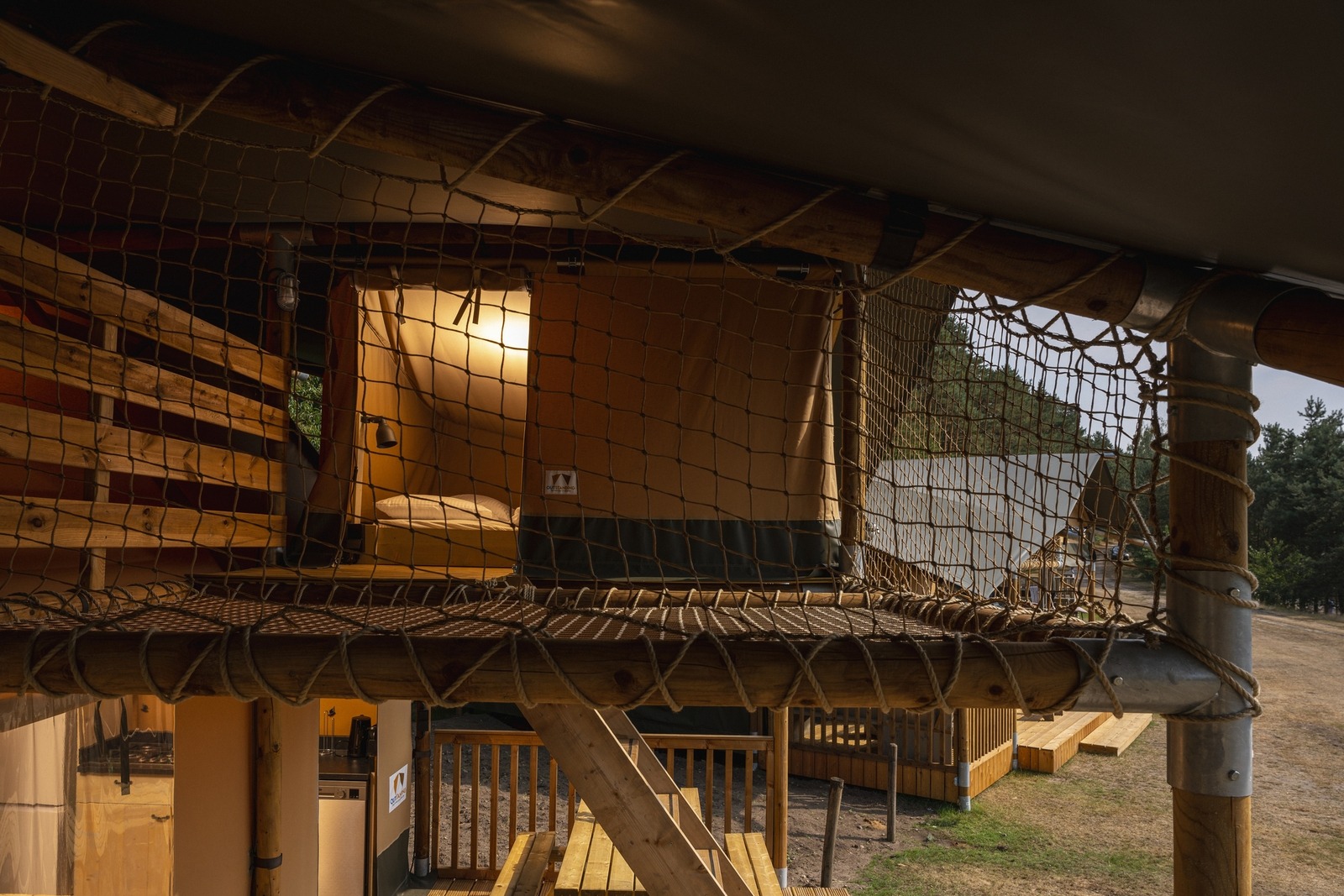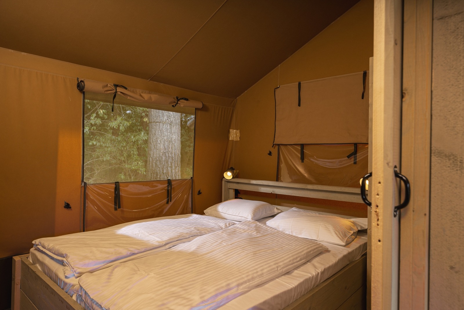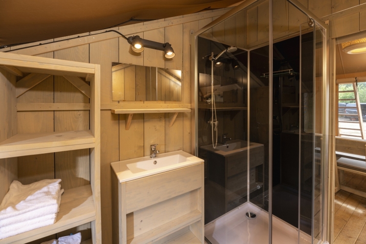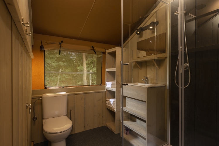 Das Zelt verfügt über drei Schlafzimmer sowie eine Schlafgalerie mit Doppelbett, sodass bis zu sieben Personen komfortabel übernachten können. Das Badezimmer ist mit Dusche, Waschbecken und WC ausgestattet. Bettwäsche, Bettdecken und Kissen sind inklusive.