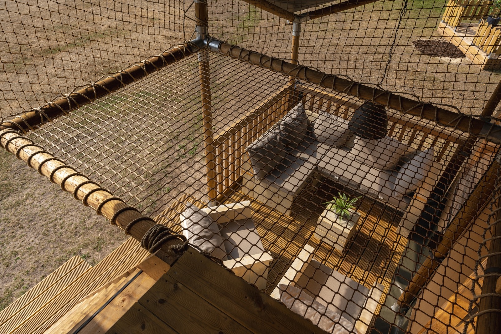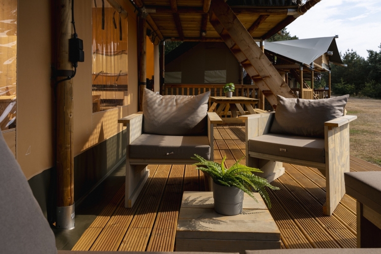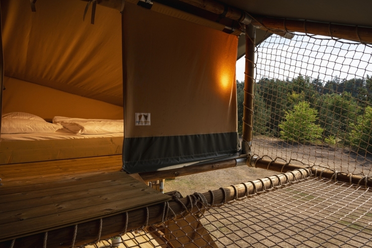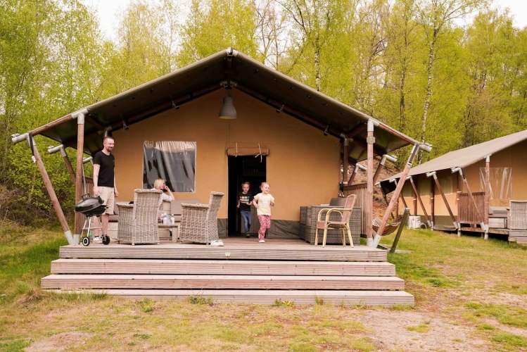 Das Safarizelt liegt in einem waldreichen Gebiet, umgeben von sanften Hügeln und weitläufigen Heideflächen. Direkt neben dem Zelt befindet sich ein Badesee mit Sandstrand – ideal für eine erfrischende Abkühlung oder einen entspannten Tag in der Sonne. Für Kinder stehen mehrere Spielplätze sowie ein Wasserspielplatz zur Verfügung.