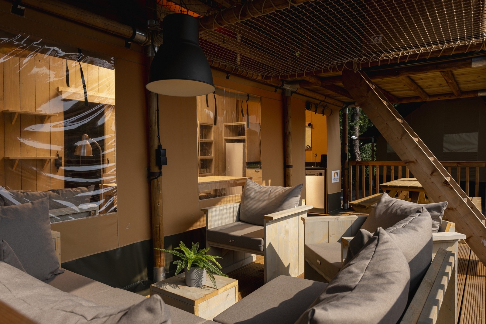 Dieses Safarizelt verbindet echtes Campinggefühl mit dem Komfort eines Ferienhauses. Der helle Wohnbereich verfügt über einen Essplatz und eine gemütliche Sitzecke, während die Küche vollständig ausgestattet ist mit Geschirrspüler, Geschirr, Kochutensilien, Kaffeemaschine und Wasserkocher.