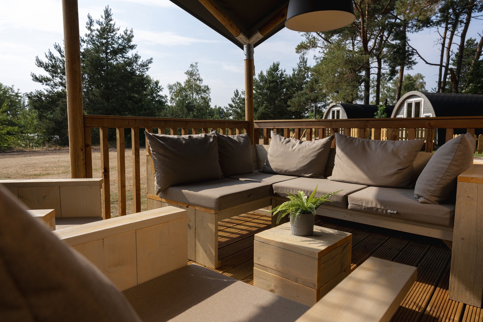 Draußen lädt die Holzveranda mit Loungeset dazu ein, das Leben im Freien und die Geräusche der Natur zu genießen.