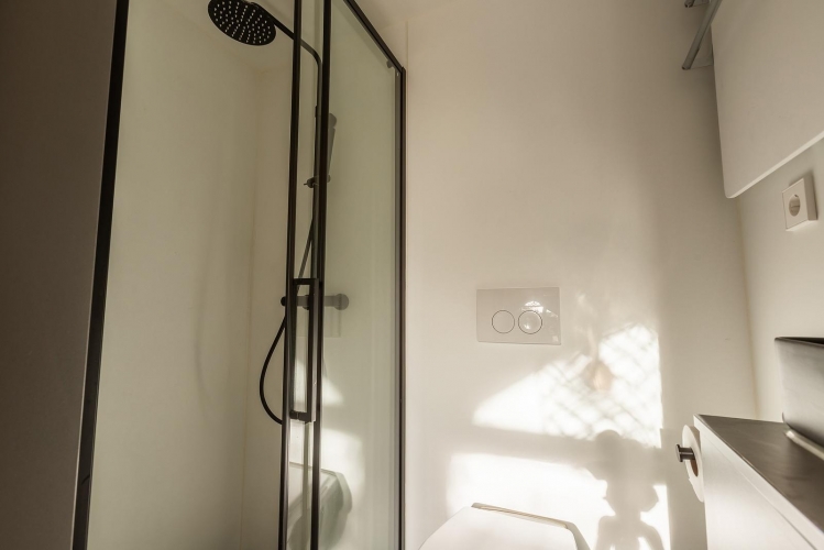 Das Badezimmer verfügt über eine Regendusche, Waschbecken und WC. Der Schlafbereich ist praktisch in den Wohnraum integriert.