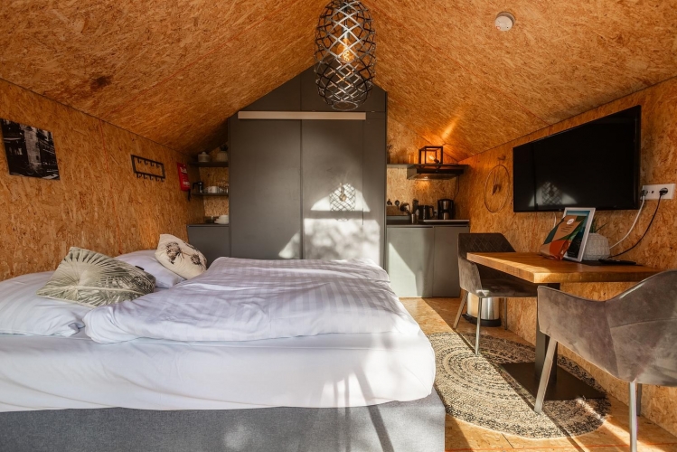 Das Tiny House ist kompakt und durchdacht eingerichtet, sodass alle Einrichtungen effizient angeordnet sind. Im Wohn- und Schlafbereich befindet sich eine Sitzecke mit Smart-TV und WLAN – ein angenehmer Ort, um den Tag ruhig ausklingen zu lassen. Die Kitchenette ist mit Induktionskochfeld, Kühlschrank mit Gefrierfach, Filterkaffeemaschine und Wasserkocher ausgestattet, sodass Frühstück oder einfache Mahlzeiten schnell zubereitet sind.